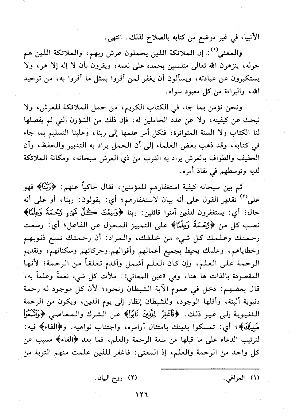 والمعنى (¬1): إن الملائكة الذين يحملون عرش ربهم، والملائكة الذين هم حوله، ينزهون الله تعالى متلبسين بحمده على نعمه، ويقرون بأن لا إله إلا هو، ولا يستكبرون عن عبادته، ويسألون أن يغفر لمن أقروا بمثل ما أقروا به، من توحيد الله، والبراءة من كل معبود سواه.