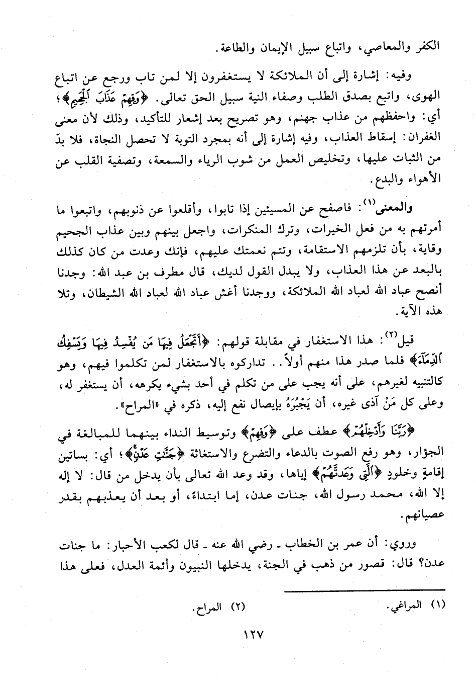 8 - {رَبَّنَا وَأَدْخِلْهُمْ} عطف على {وَقِهِمْ} وتوسيط النداء بينهما للمبالغة في الجؤار، وهو رفع الصوت بالدعاء والتضرع والاستغاثة {جَنَّاتِ عَدْنٍ}؛ أي: بساتين إقامةٍ وخلودٍ {الَّتِي وَعَدْتَهُمْ} إياها، وقد وعد الله تعالى بأن يدخل من قال: لا إله إلا الله، محمد رسول الله، جنات عدن، إما ابتداءً، أو بعد أن يعذبهم بقدر عصيانهم.