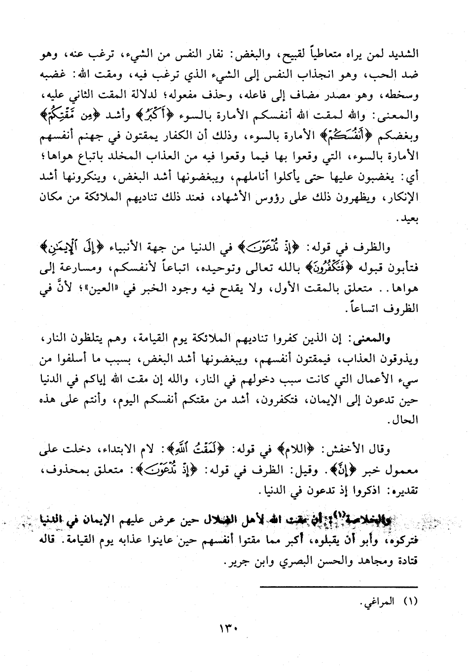 الشديد لمن يراه متعاطيًا لقبيح، والبغض: نفار النفس من الشيء، ترغب عنه، وهو ضد الحب، وهو انجذاب النفس إلى الشيء الذي ترغب فيه، ومقت الله: غضبه وسخطه، وهو مصدر مضاف إلى فاعله، وحذف مفعوله؛ لدلالة المقت الثاني عليه، والمعنى: والله لمقت الله أنفسكم الأمارة بالسوء {أَكبَرُ} وأشد {مِنْ مَقْتِكُمْ} وبغضكم {أَنْفُسَكُمْ} الأمارة بالسوء، وذلك أن الكفار يمقتون في جهنم أنفسهم الأمارة بالسوء، التي وقعوا بها فيما وقعوا فيه من العذاب المخلد باتباع هواها؛ أي: يغضبون عليها حتى يأكلوا أناملهم، ويبغضونها أشد البغض، وينكرونها أشد الإنكار، ويظهرون ذلك على رؤوس الأشهاد، فعند ذلك تناديهم الملائكة من مكان بعيد.