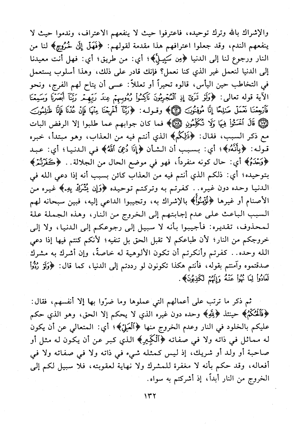 والإشراك بالله وترك توحيده، فاعترفوا حيث لا ينفعهم الاعتراف، وندموا حيث لا ينفعهم الندم، وقد جعلوا اعترافهم هذا مقدمة لقولهم: {فَهَلْ إِلَى خُرُوجٍ} لنا من النار ورجوع لنا إلى الدنيا {مِنْ سَبِيلٍ}؛ أي: من طريق؛ أي: فهل أنت معيدنا إلى الدنيا لنعمل غير الذي كنا نعمل؟ فإنك قادر على ذلك، وهذا أسلوب يستعمل في التخاطب حين اليأس، قالوه تحيرًا أو تعللًا: عسى أن يتاح لهم الفرج، ونحو الآية قوله تعالى: {وَلَوْ تَرَى إِذِ الْمُجْرِمُونَ نَاكِسُو رُءُوسِهِمْ عِنْدَ رَبِّهِمْ رَبَّنَا أَبْصَرْنَا وَسَمِعْنَا فَارْجِعْنَا نَعْمَلْ صَالِحًا إِنَّا مُوقِنُونَ (12)} وقوله: {رَبَّنَا أَخْرِجْنَا مِنْهَا فَإِنْ عُدْنَا فَإِنَّا ظَالِمُونَ (107) قَالَ اخْسَئُوا فِيهَا وَلَا تُكَلِّمُونِ (108)}