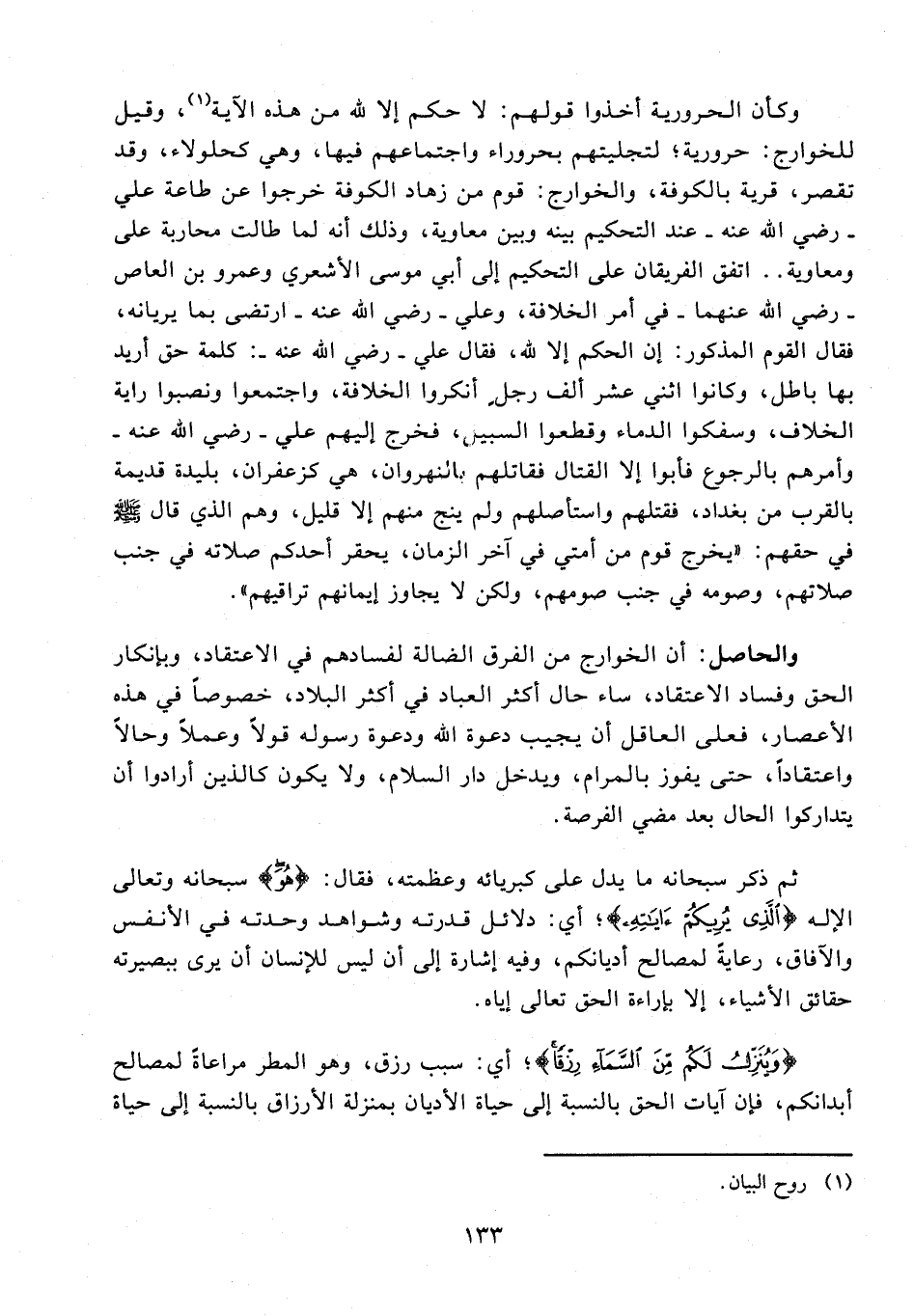 والحاصل: أن الخوارج من الفرق الضالة لفسادهم في الاعتقاد، وبإنكار الحق وفساد الاعتقاد، ساء حال أكثر العباد في أكثر البلاد، خصوصًا في هذه الأعصار، فعلى العاقل أن يجيب دعوة الله ودعوة رسوله قولًا وعملًا وحالًا واعتقادًا، حتى يفوز بالمرام، ويدخل دار السلام، ولا يكون كالذين أرادوا أن يتداركوا الحال بعد مضي الفرصة.