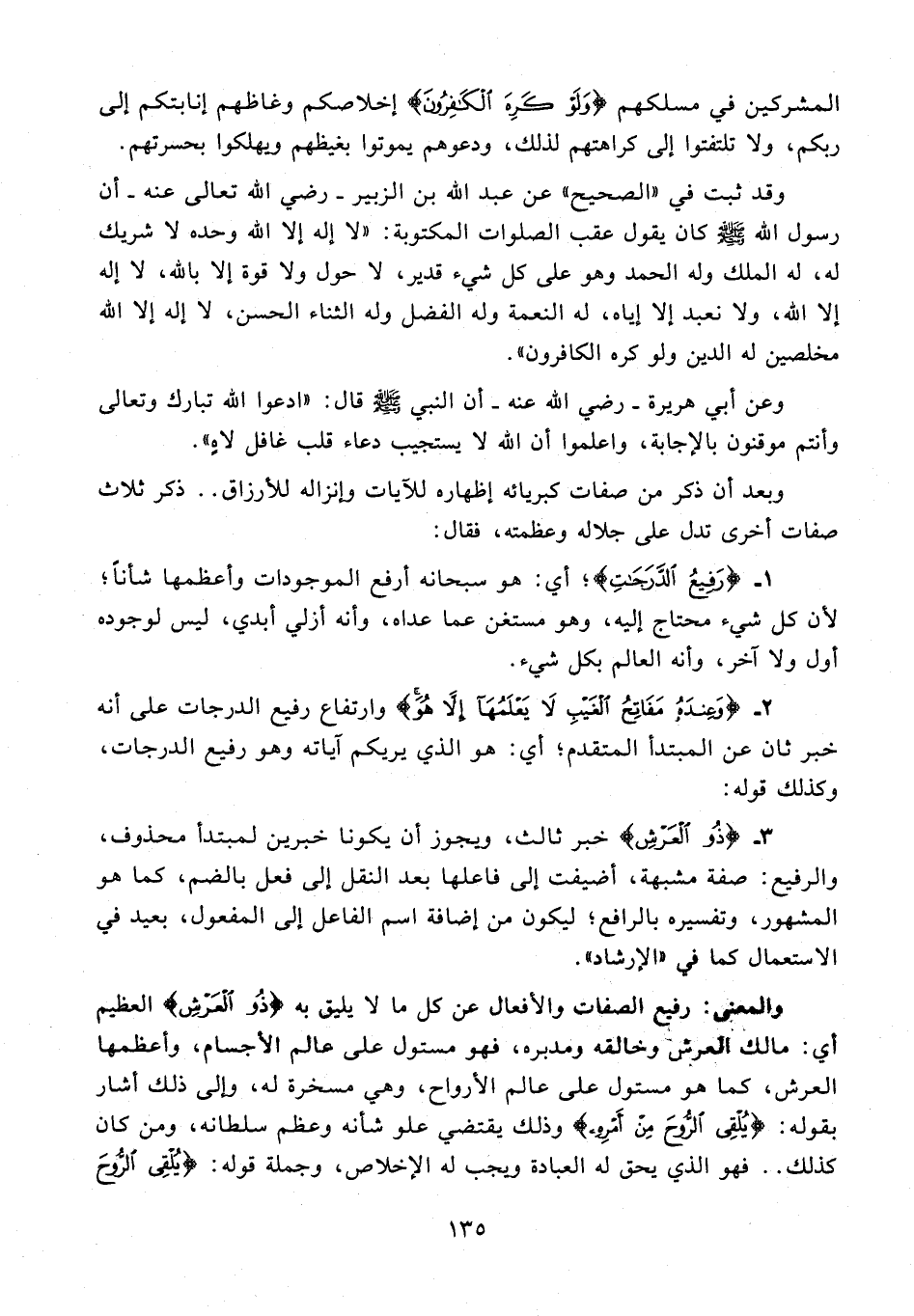15 - وبعد أن ذكر من صفات كبريائه إظهاره للآيات وإنزاله للأرزاق .. ذكر ثلاث صفات أخرى تدل على جلاله وعظمته، فقال: