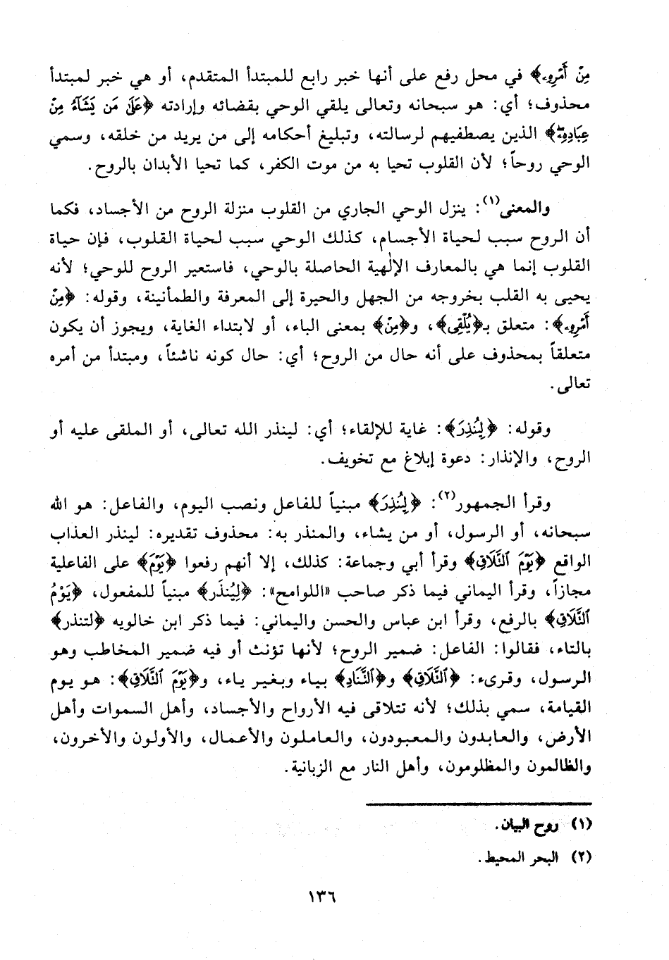 وقرأ الجمهور (¬2): {لِيُنْذِرَ} مبنيًا للفاعل ونصب اليوم، والفاعل: هو الله سبحانه، أو الرسول، أو من يشاء، والمنذر به: محذوف تقديره: لينذر العذاب الواقع {يَوْمَ التَّلَاقِ} وقرأ أبي وجماعة: كذلك، إلا أنهم رفعوا {يَوْمَ} على الفاعلية مجازًا، وقرأ اليماني فيما ذكر صاحب "اللوامح": {ليُنذَر} مبنيًا للمفعول، {يَوْمَ التَّلَاقِ} الرفع، وقرأ ابن عباس والحسن واليماني: فيما ذكر ابن خالويه {لتنذر} بالتاء، فقالوا: الفاعل: ضمير الروح؛ لأنها تؤنث أو فيه ضمير المخاطب وهو الرسول، وقرىء: {التَّلَاقِ} و {اْلتَّنَادِ} بياء وبغير ياء، و {يَوْمَ التَّلَاقِ}: هو يوم القيامة، سمي بذلك؛ لأنه تتلاقى فيه الأرواح والأجساد، وأهل السموات وأهل الأرض، والعابدون والمعبودون، والعاملون والأعمال، والأولون والأخرون، والظالمون والمظلومون، وأهل النار مع الزبانية.