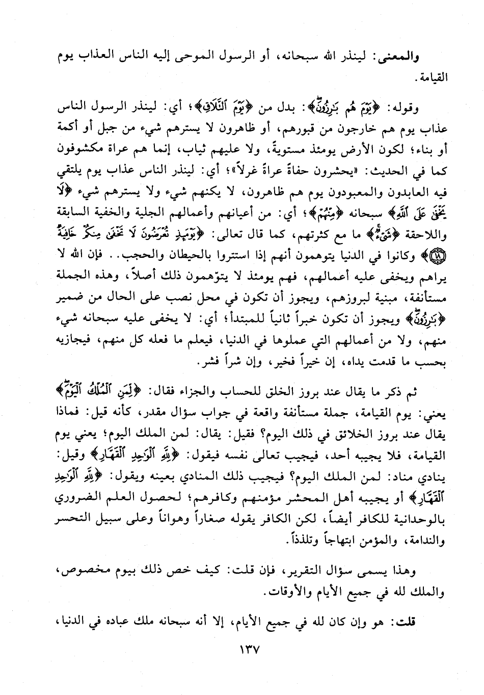 16 - وقوله: {يَوْمَ هُمْ بَارِزُونَ}: بدل من {يَوْمَ التَّلَاقِ}؛ أي: لينذر الرسول الناس عذاب يوم هم خارجون من قبورهم، أو ظاهرون لا يسترهم شيء من جبل أو أكمة أو بناء؛ لكون الأرض يومئذ مستويةً، ولا عليهم ثياب، إنما هم عراة مكشوفون كما في الحديث: "يحشرون حفاةً عراةً غرلًا"؛ أي: لينذر الناس عذاب يوم يلتقي فيه العابدون والمعبودون يوم هم ظاهرون، لا يكنهم شيء ولا يسترهم شيء {لَا يَخْفَى عَلَى اللَّهِ} سبحانه {مِنْهُمْ}؛ أي: من أعيانهم وأعمالهم الجلية والخفية السابقة واللاحقة {شَيْءٌ} ما مع كثرتهم، كما قال تعالى: {يَوْمَئِذٍ تُعْرَضُونَ لَا تَخْفَى مِنْكُمْ خَافِيَةٌ (18)} وكانوا في الدنيا يتوهمون أنهم إذا استتروا بالحيطان والحجب .. فإن الله لا يراهم ويخفى عليه أعمالهم، فهم يومئذ لا يتوّهمون ذلك أصلًا، وهذه الجملة مستأنفة، مبنية لبروزهم، ويجوز أن تكون في محل نصب على الحال من ضمير {بَارِزُونَ} ويجوز أن تكون خبرًا ثانيًا للمبتدأ؛ أي: لا يخفى عليه سبحانه شيء منهم، ولا من أعمالهم التي عملوها في الدنيا، فيعلم ما فعله كل منهم، فيجازيه بحسب ما قدمت يداه، إن خيرًا فخير، وإن شرًا فشر.