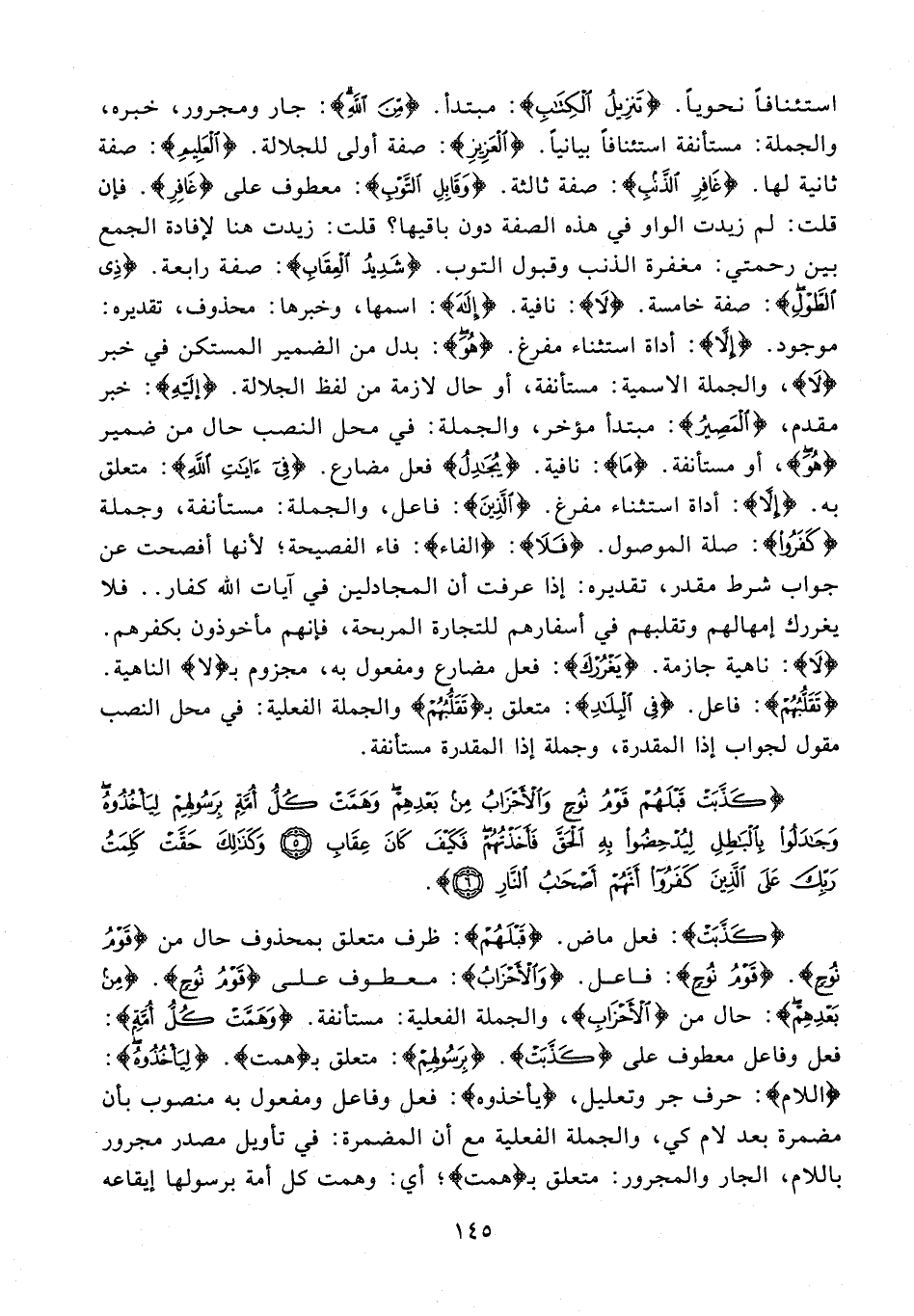 استئنافًا نحويًا. {تَنْزِيلُ الْكِتَابِ}: مبتدأ. {مِنَ اللَّهِ}: جار ومجرور، خبره، والجملة: مستأنفة استئنافًا بيانيًا. {الْعَزِيزِ}: صفة أولى للجلالة. {الْعَلِيمِ}: صفة ثانية لها. {غَافِرِ الذَّنْبِ}: صفة ثالثة. {وَقَابِلِ التَّوْبِ}: معطوف على {غَافِرِ}. فإن قلت: لم زيدت الواو في هذه الصفة دون باقيها؟ قلت: زيدت هنا لإفادة الجمع بين رحمتي: مغفرة الذنب وقبول التوب. {شَدِيدِ الْعِقَابِ}: صفة رابعة. {ذِي الطَّوْلِ}: صفة خامسة. {لَا}: نافية. {إلَهَ}: اسمها، وخبرها: محذوف، تقديره: موجود. {إلَّا}: أداة استثناء مفرغ. {هُو}: بدل من الضمير المستكن في خبر {لَا}، والجملة الاسمية: مستأنفة، أو حال لازمة من لفظ الجلالة. {إليه}: خبر مقدم، {الْمَصِيرُ}: مبتدأ مؤخر، والجملة: في محل النصب حال من ضمير {هُوَ}، أو مستأنفة. {مَا}: نافية. {يُجَادِلُ} فعل مضارع. {فِي آيَاتِ اللَّهِ}: متعلق به. {إلَّا}: أداة استثناء مفرغ {الَّذِينَ}: فاعل، والجملة: مستأنفة، وجملة {كَفَرُوا}: صلة الموصول. {فَلَا}: {الفاء}: فاء الفصيحة؛ لأنها أفصحت عن جواب شرط مقدر، تقديره: إذا عرفت أن المجادلين في آيات الله كفار .. فلا يغررك إمهالهم وتقلبهم في أسفارهم للتجارة المربحة، فإنهم مأخوذون بكفرهم. {لَا}: ناهية جازمة. {يَغرُرْكَ}: فعل مضارع ومفعول به، مجزوم بـ {لا} الناهية. {تَقَلُّبُهُمْ}: فاعل. {فِي الْبِلَادِ}: متعلق بـ {تَقَلُّبُهُمْ} والجملة الفعلية: في محل النصب مقول لجواب إذا المقدرة، وجملة إذا المقدرة مستأنفة.