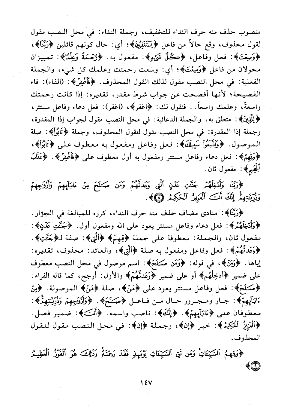{رَبَّنَا}: منادى مضاف حذف منه حرف النداء، كرره للمبالغة في الجؤار. {وَأَدْخِلْهُمْ}: فعل دعاء وفاعل مستتر يعود على الله ومفعول أول. {جَنَّاتِ عَدْنٍ}: مفعول ثان، والجملة: معطوفة على جملة {قِهِمْ} {الَّتِي}: صفة لـ {جَنَّاتِ}. {وَعَدتهُمْ}: فعل وفاعل ومفعول به صلة {الَّتِي}، والعائد: محذوف، تقديره: إياها. {وَمَن}، في قوله: {وَمَنْ صَلَحَ}: اسم موصول في محل النصب معطوف على ضمير {أدخِلْهُم} أو على ضمير {وَعَدْتَهُمْ} والأول: أرجح، كما قاله الفراء. {صَلَحَ}: فعل وفاعل مستتر يعود على {مَنْ}، صلة {مَنْ} الموصولة. {مِنْ آبَائِهِمْ}: جار ومجرور حال من فاعل {صَلَحَ}. {وَأَزْوَاجِهِمْ وَذُرِّيَّاتِهِمْ}: معطوفان على {آبَائِهِمْ}. {إنَّكَ}: ناصب واسمه. {أَنْتَ}: ضمير فصل. {الْعَزِيزُ الْحَكِيمُ}: خبر {إن}، وجملة {إن}: في محل النصب مقول للقول المحذوف.