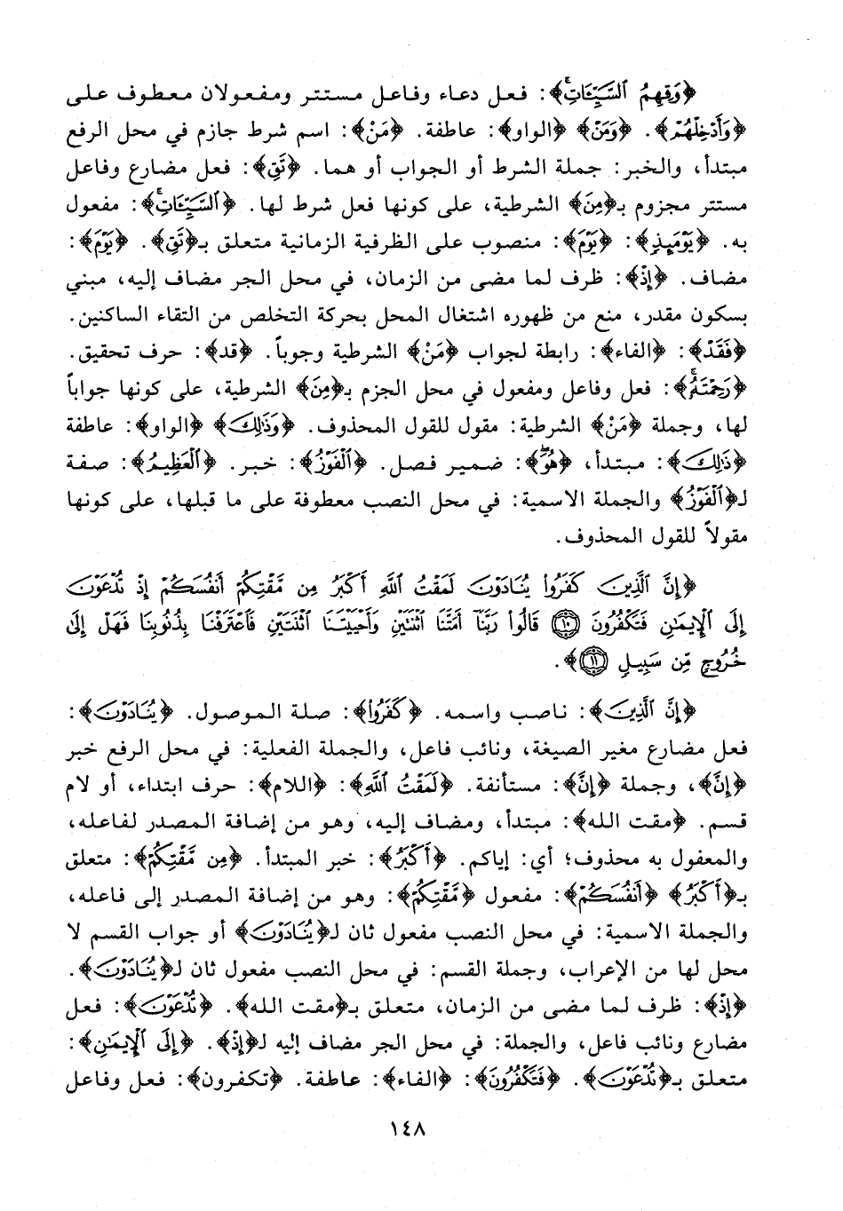 {إِنَّ الَّذِينَ}: ناصب واسمه. {كَفَرُوا}: صلة الموصول. {يُنَادَوْنَ}: فعل مضارع مغير الصيغة، ونائب فاعل، والجملة الفعلية: في محل الرفع خبر {إنَّ}، وجملة {إنَّ}: مستأنفة. {لَمَقْتُ اللَّهِ}: {اللام}: حرف ابتداء، أو لام قسم. {مقت الله}: مبتدأ، ومضاف إليه، وهو من إضافة المصدر لفاعله، والمعفول به محذوف؛ أي: إياكم. {أَكبَرُ}: خبر المبتدأ. {مِنْ مَقْتِكُمْ}: متعلق بـ {أَكبَرُ} {أَنْفُسَكُمْ}: مفعول {مَقْتِكُمْ}: وهو من إضافة المصدر إلى فاعله، والجملة الاسمية: في محل النصب مفعول ثان لـ {يُنَادَوْنَ} أو جواب القسم لا محل لها من الإعراب، وجملة القسم: في محل النصب مفعول ثان لـ {يُنَادَوْنَ}. {إذْ}: ظرف لما مضى من الزمان، متعلق بـ {مقت الله}. {تُدْعَوْنَ}: فعل مضارع ونائب فاعل، والجملة: في محل الجر مضاف إليه لـ {إذْ}. {إِلَى الْإِيمَانِ}: متعلق بـ {تُدْعَوْنَ}. {فَتَكْفُرُونَ}: {الفاء}: عاطفة. {تكفرون}: فعل وفاعل