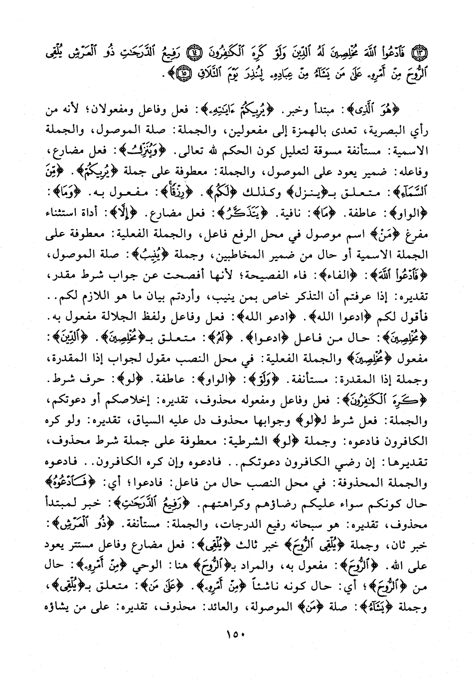 {هُوَ اْلَذِى}: مبتدأ وخبر {يُرِيكُمْ آيَاتِهِ}: فعل وفاعل ومفعولان؛ لأنه من رأي البصرية، تعدى بالهمزة إلى مفعولين، والجملة: صلة الموصول، والجملة الاسمية: مستأنفة مسوقة لتعليل كون الحكم لله تعالى. {وَيُنَزِّلُ}: فعل مضارع، وفاعله: ضمير يعود على الموصول، والجملة: معطوفة على جملة {يُرِيكُمْ}. {مِنَ السَّمَاءِ}: متعلق بـ {ينزل} وكذلك {لَكمُ}. {رِزْقًا}: مفعول به. {وَمَا}: {الواو}: عاطفة. {مَا}: نافية. {يَتَذَكَّرُ}: فعل مضارع. {إلَّا}: أداة استثناء مفرغ {مَنْ} اسم موصول في محل الرفع فاعل، والجملة الفعلية: معطوفة على الجملة الاسمية أو حال من ضمير المخاطبين، وجملة {يُنِيبُ}: صلة الموصول، {فَادْعُوا اللَّهَ}: {الفاء}: فاء الفصيحة؛ لأنها أفصحت عن جواب شرط مقدر، تقديره: إذا عرفتم أن التذكر خاص بمن ينيب، وأردتم بيان ما هو اللازم لكم .. فأقول لكم {ادْعُوا اللَّهَ}. {ادْعُوا اللَّهَ}: فعل وفاعل ولفظ الجلالة مفعول به. {مُخْلِصِينَ}: حال من فاعل {ادعوا}. {لَه}: متعلق بـ {مُخْلِصِينَ}. {الدِّينَ}: مفعول {مُخْلِصِينَ} والجملة الفعلية: في محل النصب مقول لجواب إذا المقدرة، وجملة إذا المقدرة: مستأنفة. {وَلَوْ}: {الواو}: عاطفة. {لو}: حرف شرط. {كَرِهَ الْكَافِرُونَ}: فعل وفاعل ومفعوله محذوف، تقديره: إخلاصكم أو دعوتكم، والجملة: فعل شرط لـ {لو} وجوابها محذوف دل عليه السياق، تقديره: ولو كره الكافرون فادعوه: وجملة {لو} الشرطية: معطوفة على جملة شرط محذوف، تقديرها: إن رضي الكافرون دعوتكم .. فادعوه وإن كره الكافرون .. فادعوه والجملة المحذوفة: في محل النصب حال من فاعل: فادعوا؛ أي: {فَادْعُوُه} حال كونكم سواء عليكم رضاؤهم وكراهتهم. {رَفِيعُ الدَّرَجَاتِ}: خبر لمبتدأ محذوف، تقديره: هو سبحانه رفيع الدرجات، والجملة: مستأنفة. {ذُو الْعَرْشِ}: خبر ثان، وجملة {يُلْقِي الرُّوحَ} خبر ثالث {يُلْقِي}: فعل مضارع وفاعل مستتر يعود على الله. {الرُّوحَ}: مفعول به، والمراد بـ {الرُّوحَ} هنا: الوحي {مِنْ أَمْرِهِ}: حال من {الرُّوحَ}؛ أي: حال كونه ناشئًا {مِنْ أَمْرِهِ}. {عَلَى مَنْ}: متعلق بـ {يُلْقِي}، وجملة {يَشَاءُ}: صلة {مَن} الموصولة، والعائد: محذوف، تقديره: على من يشاؤه