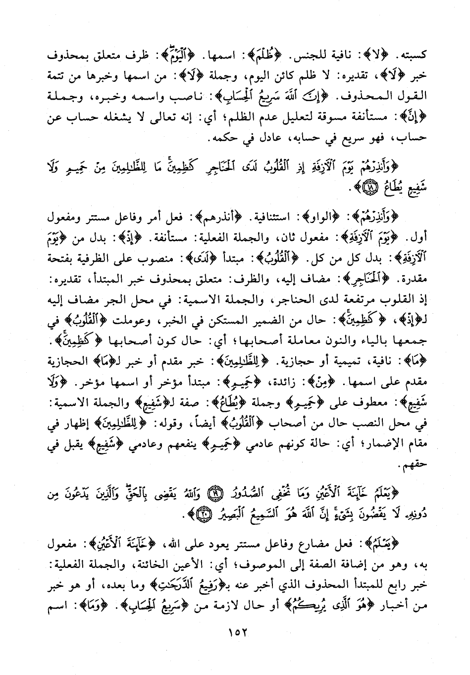 {وَأَنْذِرْهُمْ}: {الواو}: استئنافية. {أنذرهم}: فعل أمر وفاعل مستتر ومفعول أول. {يَوْمَ الْآزِفَةِ}: مفعول ثان، والجملة الفعلية: مستأنفة. {إِذِ}: بدل من {يَوْمَ الْآزِفَةِ}: بدل كل من كل. {الْقُلُوبُ}: مبتدأ {لَدَى}: منصوب على الظرفية بفتحة مقدرة. {الْحَنَاجِرِ}: مضاف إليه، والظرف: متعلق بمحذوف خبر المبتدأ، تقديره: إذ القلوب مرتفعة لدى الحناجر، والجملة الاسمية: في محل الجر مضاف إليه لـ {إِذِ}، {كَاظِمِينَ}: حال من الضمير المستكن في الخبر، وعوملت {الْقُلُوبُ} في جمعها بالياء والنون معاملة أصحابها؛ أي: حال كون أصحابها {كَاظِمِينَ}. {مَا}: نافية، تميمية أو حجازية. {لِلظَّالِمِينَ}: خبر مقدم أو خبر لـ {مَا} الحجازية مقدم على اسمها. {مِنْ}: زائدة، {حَمِيمٍ}: مبتدأ مؤخر أو اسمها مؤخر. {وَلَا شَفِيعٍ}: معطوف على {حَمِيمٍ} وجملة {يُطَاعُ}: صفة لـ {شَفِيعٍ} والجملة الاسمية: في محل النصب حال من أصحاب {الْقُلُوبُ} أيضًا، وقوله: {لِلظَّالِمِينَ} إظهار في مقام الإضمار؛ أي: حالة كونهم عادمي {حَمِيمٍ} ينفعهم وعادمي {شَفِيعٍ} يقبل في حقهم.