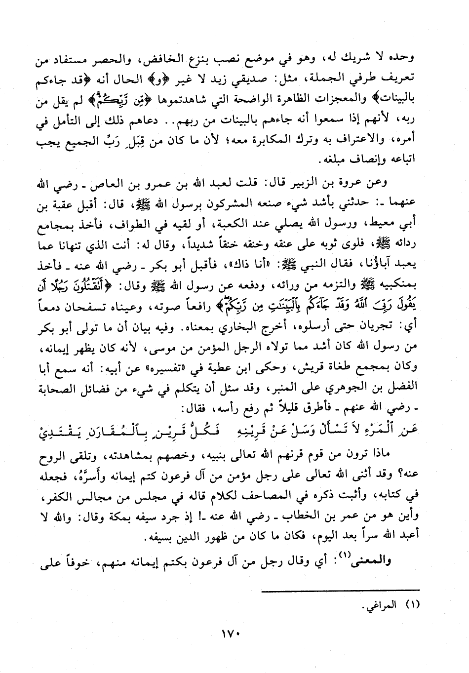 ماذا ترون من قوم قرنهم الله تعالى بنبيه، وخصهم بمشاهدته، وتلقى الروح عنه؟ وقد أثنى الله تعالى على رجل مؤمن من آل فرعون كتم إيمانه وأَسرَّهُ، فجعله في كتابه، وأثبت ذكره في المصاحف لكلام قاله في مجلس من مجالس الكفر، وأين هو من عمر بن الخطاب - رضي الله عنه -! إذ جرد سيفه بمكة وقال: والله لا أعبد الله سرًا بعد اليوم، فكان ما كان من ظهور الدين بسيفه.