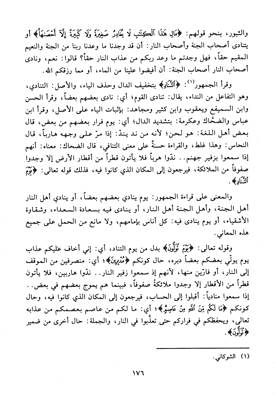 وقرأ الجمهور (¬1): {التَّنَادِ} بتخفيف الدال وحذف الياء، والأصل: التنادي، وهو التفاعل من النداء، يقال: تنادى القوم؛ أي: نادى بعضهم بعضًا، وقرأ الحسن وابن السميفع ويعقوب وابن كثير ومجاهد: بإثبات الياء على الأصل، وقرأ ابن عباس والضحَّاك وعكرمة: بتشديد الدال؛ أي: يوم فرار بعضهم من بعض، قال بعض أهل اللغة: هو لحن؛ لأنه من ند يندّ: إذا مرّ على وجهه هاربًا، قال النحاس: وهذا غلط، والقراءة حسنةٌ على معنى التنافي، قال الضحاك: معناه: أنهم إذا سمعوا بزفير جهنم .. ندّوا هربًا فلا يأتون قطرًا من أقطار الأرض إلا وجدوا صفوفًا من الملائكة، فيرجعون إلى المكان الذي كانوا فيه، فذلك قوله تعالى: {يَوْمَ التَّنَادِ}.