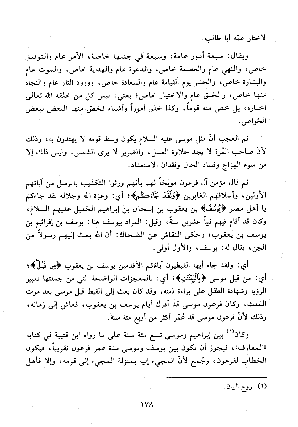 ويقال: سبعة أمور عامة، وسبعة في جنبها خاصة، الأمر عام والتوفيق خاص، والنهي عام والعصمة خاص، والدعوة عام والهداية خاص، والموت عام والبشارة خاص، والحشر يوم القيامة عام والسعادة خاص، وورود النار عام والنجاة منها خاص، والخلق عام والاختيار خاص؛ يعني: ليس كل من خلقه الله تعالى اختاره، بل خص منه قومًا، وكذا خلق أمورًا وأشياء فخصّ منها البعض ببعض الخواص.