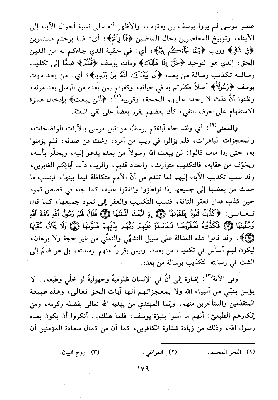 والمعنى (¬2): أي ولقد جاء آباءَكم يوسفُ من قبل موسى بالآيات الواضحات، والمعجزات الباهرات، فلم يزالوا في ريب من أمره، وشك من صدقه، فلم يؤمنوا به، حتى إذا مات قالوا: لن يبعث الله رسولًا من بعده يدعو إليه، ويحذّر بأسه، ويخوّف من عقابه، فالتكذيب متوارث، والعناد قديم، والريب دأب آبائِكم الغابرين، وقد نسب تكذيب الآباء إليهم لما تقدم من أنّ الأمم متكافلة فيما بينها، فينسب ما حدث من بعضها إلى جميعها إذا تواطؤوا واتفقوا عليه، كما جاء في قصص ثمود حين كذب قدار فعقر الناقة، فنسب التكذيب والعقر إلى ثمود جميعها، كما قال تعالى: {كَذَّبَتْ ثَمُودُ بِطَغْوَاهَا (11) إِذِ انْبَعَثَ أَشْقَاهَا (12) فَقَالَ لَهُمْ رَسُولُ اللَّهِ نَاقَةَ اللَّهِ وَسُقْيَاهَا (13) فَكَذَّبُوهُ فَعَقَرُوهَا فَدَمْدَمَ عَلَيْهِمْ رَبُّهُمْ بِذَنْبِهِمْ فَسَوَّاهَا (14) وَلَا يَخَافُ عُقْبَاهَا (15)}. وقد قالوا هذه المقالة على سبيل التشهِّي والتمنِّي من غير حجة ولا برهان، ليكون لهم أساس في تكذيب من بعده، وليس إقرارًا منهم برسالته، بل هو ضمّ إلى الشك في رسالته التكذيب برسالة من بعده.