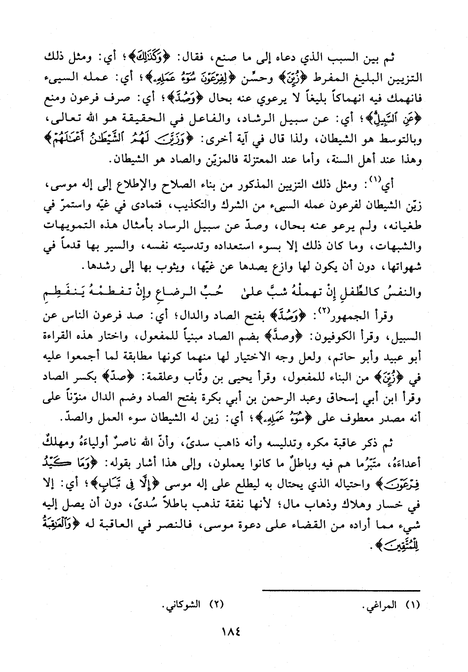 وقرأ الجمهور (¬2): {وَصُدَّ} بفتح الصاد والدال؛ أي: صد فرعون الناس عن السبيل، وقرأ الكوفيون: {وصدَّ} بضم الصاد مبنيًا للمفعول، واختار هذه القراءة أبو عبيد وأبو حاتم، ولعل وجه الاختيار لها منهما كونها مطابقة لما أجمعوا عليه في {زُيِّنَ} من البناء للمفعول، وقرأ يحيى بن وثّاب وعلقمة: {صدّ} بكسر الصاد وقرأ ابن أبي إسحاق وعبد الرحمن بن أبي بكرة بفتح الصاد وضم الدال منوّنًا على أنه مصدر معطوف على {سُوءُ عَمَلِهِ}؛ أي: زين له الشيطان سوء العمل والصدّ.