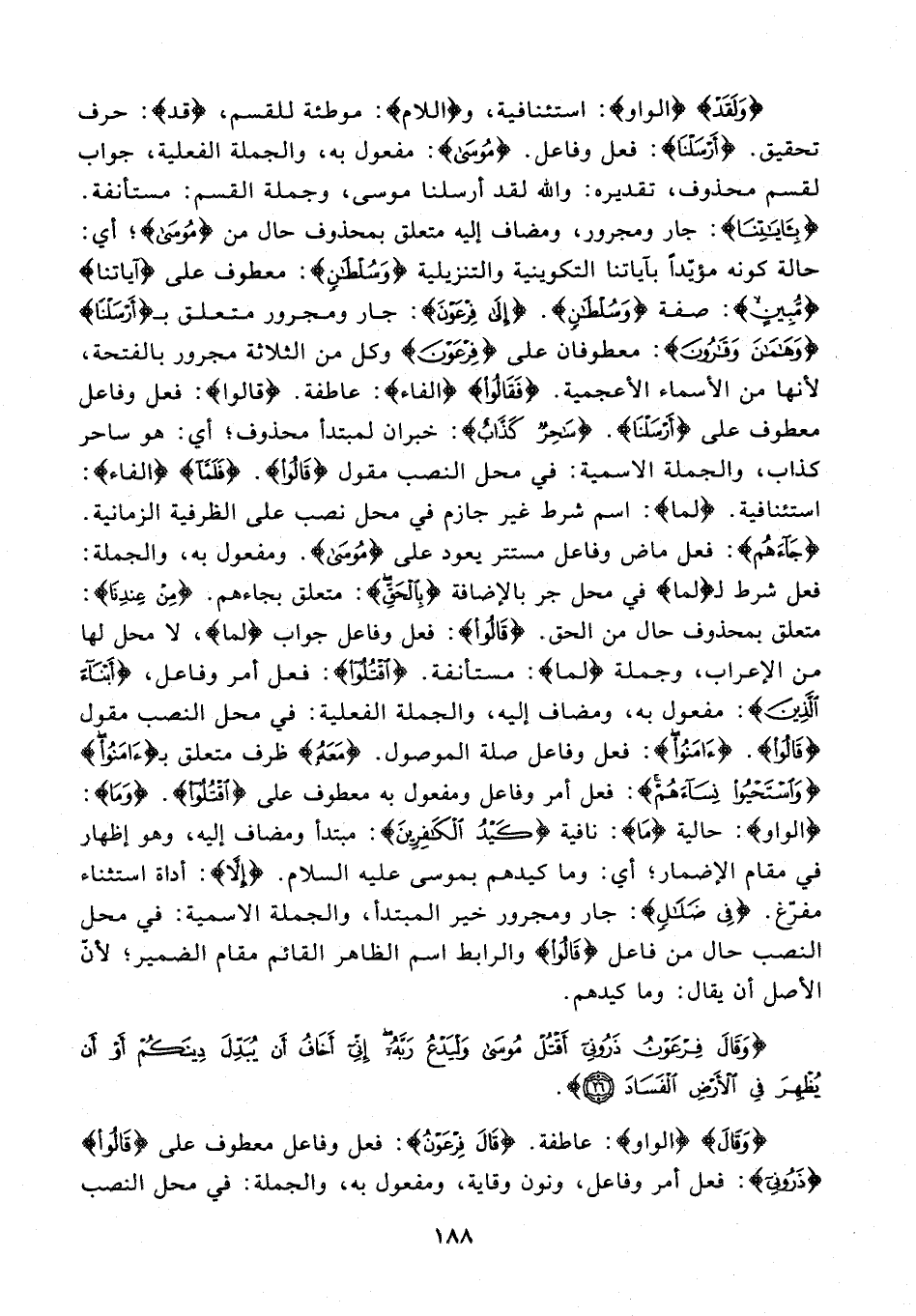 {وَلَقَدْ} {الواو}: استئنافية، و {اللام}: موطئة للقسم، {قد}: حرف تحقيق. {أَرْسَلْنَا}: فعل وفاعل. {مُوسَى}: مفعول به، والجملة الفعلية، جواب لقسم محذوف، تقديره: والله لقد أرسلنا موسى، وجمله القسم: مستأنفة. {بِآيَاتِنَا}: جار ومجرور، ومضاف إليه متعلق بمحذوف حال من {مُوسَى}؛ أي: حالة كونه مؤيّدًا بآياتنا التكوينية والتنزيلية {وَسُلْطَانٍ}: معطوف على {آياتنا} {مُبِينٍ}: صفة {وَسُلْطَانٍ}. {إِلَى فِرْعَوْنَ}: جار ومجرور متعلق بـ {أَرْسَلْنَا} {وَهَامَانَ وَقَارُونَ}: معطوفان على {فِرْعَوْنَ} وكل من الثلاثة مجرور بالفتحة، لأنها من الأسماء الأعجمية. {فَقَالُوا} {الفاء}: عاطفة. {قالوا}: فعل وفاعل معطوف على {أَرْسَلْنَا}. {سَاحِرٌ كَذَّابٌ}: خبران لمبتدأ محذوف؛ أي: هو ساحر كذاب، والجملة الاسمية: في محل النصب مقول {قَالُوا}. {فَلَمَّا} {الفاء}: استئنافية. {لما}: اسم شرط غير جازم في محل نصب على الظرفية الزمانية. {جَاءَهُمْ}: فعل ماض وفاعل مستتر يعود على {مُوسَى}. ومفعول به، والجملة: فعل شرط لـ {لما} في محل جر بالإضافة {بِالْحَقِّ}: متعلق بجاءهم. {مِنْ عِنْدِنَا}: متعلق بمحذوف حال من الحق. {قَالُوا}: فعل وفاعل جواب {لما}، لا محل لها من الإعراب، وجملة {لما}: مستأنفة. {اقْتُلُوا}: فعل أمر وفاعل، {أَبْنَاءَ الَّذِينَ}: مفعول به، ومضاف إليه، والجملة الفعلية: في محل النصب مقول {قَالُوا}. {آمَنُوا}: فعل وفاعل صلة الموصول. {مَعَهُ} ظرف متعلق بـ {آمَنُوا} {وَاسْتَحْيُوا نِسَاءَهُمْ}: فعل أمر وفاعل ومفعول به معطوف على {اقْتُلُوا}. {وَمَا}: {الواو}: حالية {مَا}: نافية {كَيْدُ الْكَافِرِينَ}: مبتدأ ومضاف إليه، وهو إظهار في مقام الإضمار؛ أي: وما كيدهم بموسى عليه السلام. {إِلَّا}: أداة استثناء مفرّغ. {فِي ضَلَالٍ}: جار ومجرور خبر المبتدأ، والجملة الاسمية: في محل النصب حال من فاعل {قَالُوا} والرابط اسم الظاهر القائم مقام الضمير؛ لأنّ الأصل أن يقال: وما كيدهم.