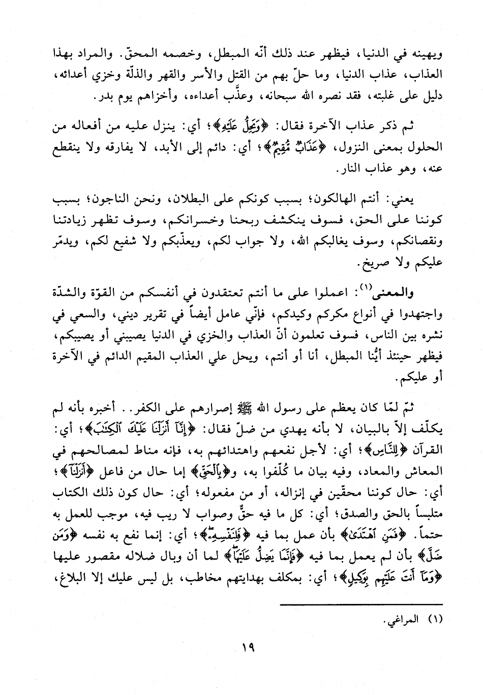 ويهينه في الدنيا، فيظهر عند ذلك أنّه المبطل، وخصمه المحقّ. والمراد بهذا العذاب، عذاب الدنيا، وما حلّ بهم من القتل والأسر والقهر والذلّة وخزي أعدائه، دليل على غلبته، فقد نصره الله سبحانه، وعذَّب أعداءه، وأخزاهم يوم بدر.