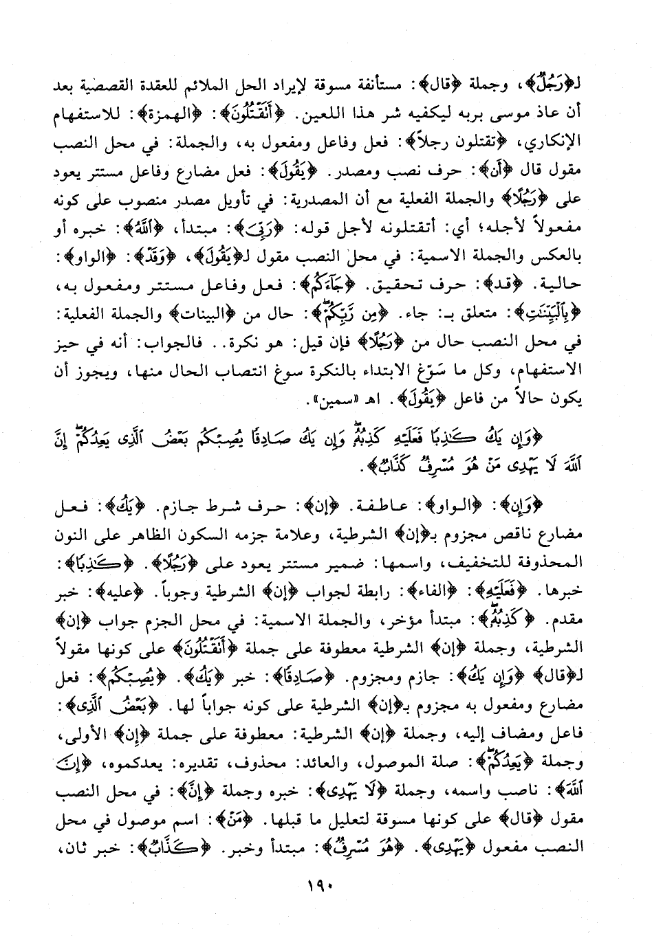{وَإِنْ}: {الواو}: عاطفة. {إن}: حرف شرط جازم. {يَكُ}: فعل مضارع ناقص مجزوم بـ {إن} الشرطية، وعلامة جزمه السكون الظاهر على النون المحذوفة للتخفيف، واسمها: ضمير مستتر يعود على {رَجُلًا}. {كَاذِبًا}: خبرها. {فَعَلَيْهِ}: {الفاء}: رابطة لجواب {إن} الشرطية وجوبًا. {عليه}: خبر مقدم. {كَذِبُهُ}: مبتدأ مؤخر، والجملة الاسمية: في محل الجزم جواب {إن} الشرطية، وجملة {إن} الشرطية معطوفة على جملة {أَتَقْتُلُونَ} على كونها مقولًا لـ {قال} {وَإِنْ يَكُ}: جازم ومجزوم. {صَادِقًا}: خبر {يَكُ}. {يُصِبْكُمْ}: فعل مضارع ومفعول به مجزوم بـ {إن} الشرطية على كونه جوابًا لها. {بَعْضُ الَّذِي}: فاعل ومضاف إليه، وجملة {إن} الشرطية: معطوفة على جملة {إِن} الأولى، وجملة {يَعِدُكُمْ}: صلة الموصول، والعائد: محذوف، تقديره: يعدكموه، {إِنَّ اللَّهَ}: ناصب واسمه، وجملة {لَا يَهْدِي}: خبره وجملة {إِنَّ}: في محل النصب مقول {قال} على كونها مسوقة لتعليل ما قبلها. {مَنْ}: اسم موصول في محل النصب مفعول {يَهْدِي}. {هُوَ مُسْرِفٌ}: مبتدأ وخبر. {كَذَّابٌ}: خبر ثان،