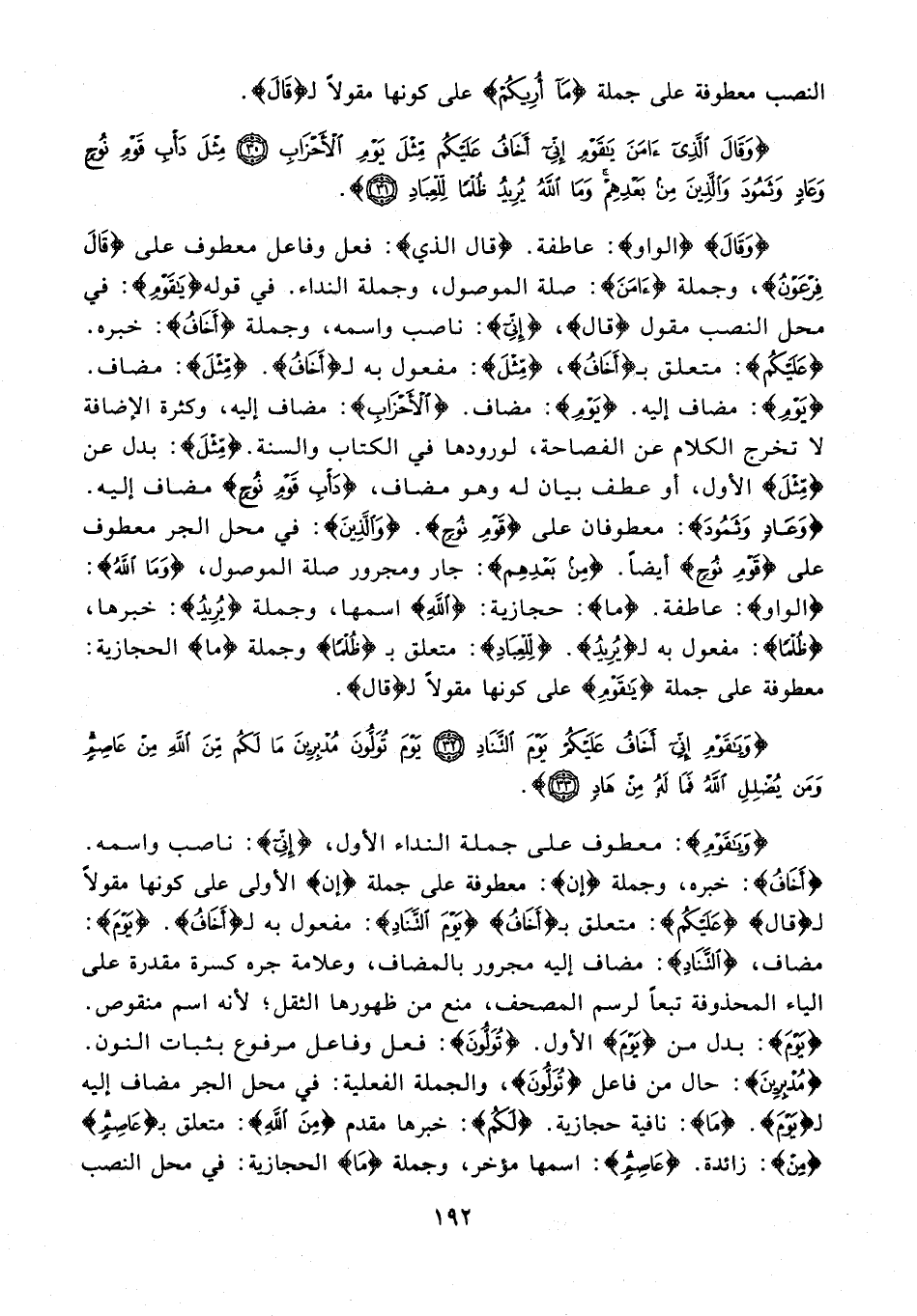 {وَقَالَ} {الواو}: عاطفة. {قال الذي}: فعل وفاعل معطوف على {قَالَ فِرْعَوْنُ}، وجملة {آمَنَ}: صلة الموصول، وجملة النداء. في قوله {يَا قَوْمِ}: في محل النصب مقول {قال}، {إِنِّي}: ناصب واسمه، وجملة {أَخَافُ}: خبره. {عَلَيْكُمْ}: متعلق بـ {أَخَافُ}، {مِثْلَ}: مفعول به لـ {أَخَافُ}. {مِثْلَ}: مضاف. {يَوْمِ}: مضاف إليه. {يَوْمِ}: مضاف. {الْأَحْزَابِ}: مضاف إليه، وكثرة الإضافة لا تخرج الكلام عن الفصاحة، لورودها في الكتاب والسنة. {مِثْلَ}: بدل عن {مِثْلَ} الأول، أو عطف بيان له وهو مضاف، {دَأْبِ قَوْمِ نُوحٍ} مضاف إليه. {وَعَادٍ وَثَمُودَ}: معطوفان على {قَوْمِ نُوحٍ}. {وَالَّذِينَ}: في محل الجر معطوف على {قَوْمِ نُوحٍ} أيضًا. {مِنْ بَعْدِهِمْ}: جار ومجرور صلة الموصول، {وَمَا اللَّهُ}: {الواو}: عاطفة، {ما}: حجازية: {اللَّهُ} اسمها، وجملة {يُرِيدُ}: خبرها، {ظُلْمًا}: مفعول به لـ {يُرِيدُ}. {لِلْعِبَادِ}: متعلق بـ {ظُلْمًا} وجملة {ما} الحجازية: معطوفة على جملة {يَا قَوْمِ} على كونها مقولًا لـ {قال}.