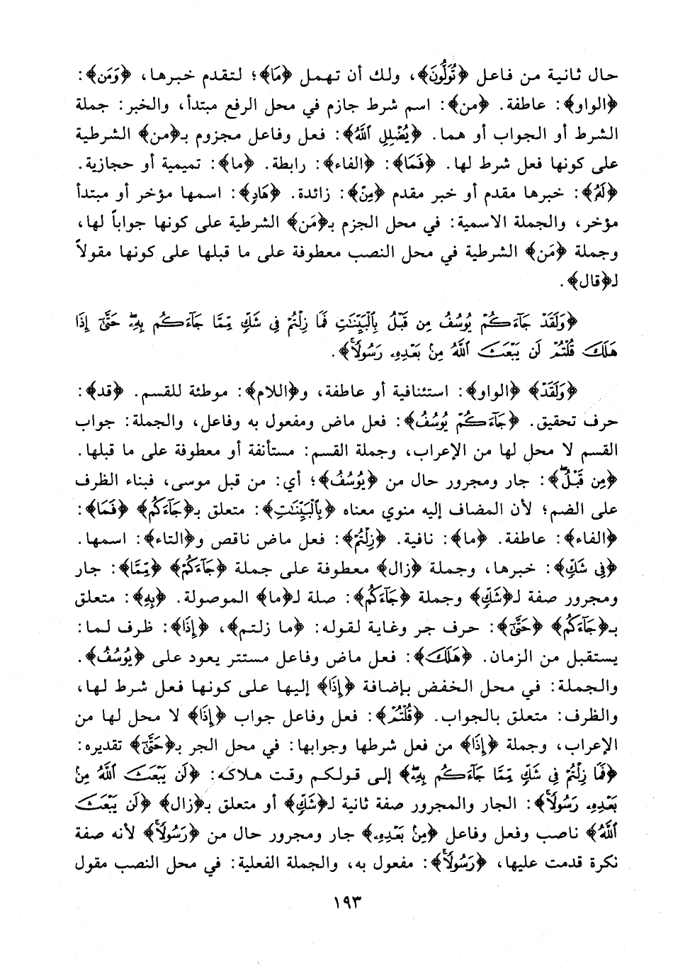 {وَلَقَدْ} {الواو}: استئنافية أو عاطفة، و {اللام}: موطئة للقسم. {قد}: حرف تحقيق. {جَاءَكُمْ يُوسُفُ}: فعل ماض ومفعول به وفاعل، والجملة: جواب القسم لا محل لها من الإعراب، وجملة القسم: مستأنفة أو معطوفة على ما قبلها. {مِنْ قَبْلُ}: جار ومجرور حال من {يُوسُفُ}؛ أي: من قبل موسى، فبناء الظرف على الضم؛ لأن المضاف إليه منوي معناه {بِالْبَيِّنَاتِ}: متعلق بـ {جَاءَكُمْ} {فَمَا}: {الفاء}: عاطفة. {ما}: نافية. {زِلْتُمْ}: فعل ماض ناقص و {التاء}: اسمها. {فِي شَكٍّ}: خبرها، وجملة {زال} معطوفة على جملة {جَاءَكُمْ} {مِمَّا}: جار ومجرور صفة لـ {شَكٍّ} وجملة {جَاءَكُمْ}: صلة لـ {ما} الموصولة. {بِهِ}: متعلق بـ {جَاءَكُمْ} {حَتَّى}: حرف جر وغاية لقوله: {ما زلتم}، {إِذَا}: ظرف لما: يستقبل من الزمان. {هَلَكَ}: فعل ماض وفاعل مستتر يعود على {يُوسُفُ}. والجملة: في محل الخفض بإضافة {إِذَا} إليها على كونها فعل شرط لها، والظرف: متعلق بالجواب. {قُلْتُمْ}: فعل وفاعل جواب {إِذَا} لا محل لها من الإعراب، وجملة {إِذَا} من فعل شرطها وجوابها: في محل الجر بـ {حَتَّى} تقديره: {فَمَا زِلْتُمْ فِي شَكٍّ مِمَّا جَاءَكُمْ بِهِ} إلى قولكم وقت هلاكَه: {لَنْ يَبْعَثَ اللَّهُ مِنْ بَعْدِهِ رَسُولًا}: الجار والمجرور صفة ثانية لـ {شَكٍّ} أو متعلق بـ {زال} {لَنْ يَبْعَثَ اللَّهُ} ناصب وفعل وفاعل {مِنْ بَعْدِهِ} جار ومجرور حال من {رَسُولًا} لأنه صفة نكرة قدمت عليها، {رَسُولًا}: مفعول به، والجملة الفعلية: في محل النصب مقول