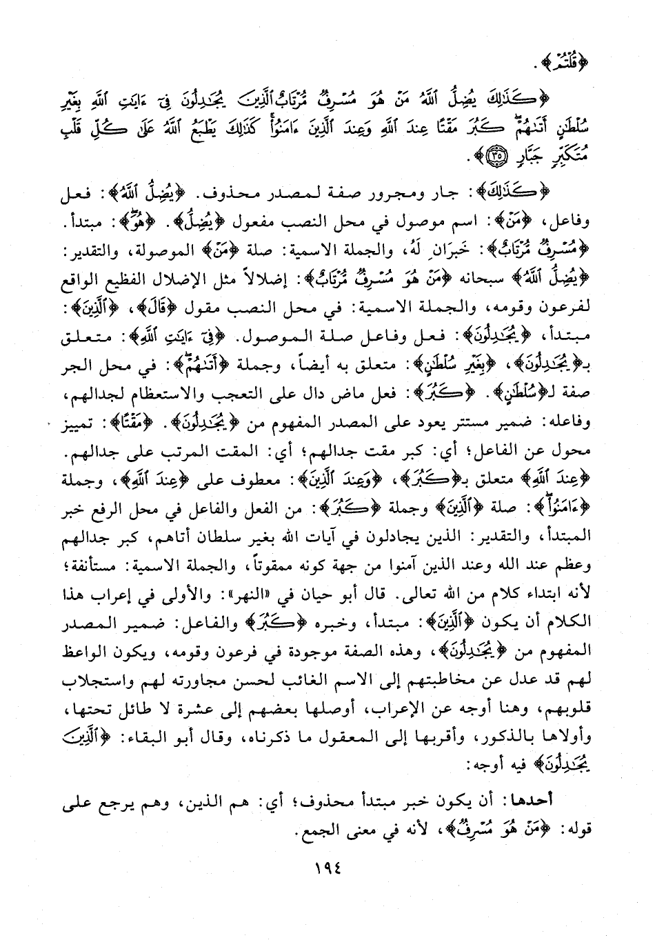 {كَذَلِكَ}: جار ومجرور صفة لمصدر محذوف. {يُضِلُّ الله}: فعل وفاعل، {مَنْ}: اسم موصول في محل النصب مفعول {يُضِلُّ}. {هُوَ}: مبتدأ. {مُسْرِفٌ مُرْتَابٌ}: خَبرَانِ لَهُ، والجملة الاسمية: صلة {مَنْ} الموصولة، والتقدير: {يُضِلُّ الله} سبحانه {مَنْ هُوَ مُسْرِفٌ مُرْتَابٌ}: إضلالًا مثل الإضلال الفظيع الواقع لفرعون وقومه، والجملة الاسمية: في محل النصب مقول {قَالَ}، {الَّذِينَ}: مبتدأ، {يُجَادِلُونَ}: فعل وفاعل صلة الموصول. {في آيَاتِ اللهِ}: متعلق بـ {يُجَادِلُونَ}، {بِغَيْرِ سُلْطَانٍ}: متعلق به أيضًا، وجملة {أَتَاهُمْ}: في محل الجر صفة لـ {سُلْطَانٍ}. {كَبُرَ}: فعل ماض قال على التعجب والاستعظام لجدالهم، وفاعله: ضمير مستتر يعود على المصدر المفهوم من {يُجَادِلُونَ}. {مَقْتًا}: تمييز محول عن الفاعل؛ أي: كبر مقت جدالهم؛ أي: المقت المرتب على جدالهم. {عِنْدَ اللهِ} متعلق بـ {كَبُرَ}، {وَعِنْدَ الَّذِينَ}: معطوف على {عِنْدَ اللهِ}، وجملة {آمَنُوا}: صلة {الَّذِينَ} وجملة {كَبُرَ}: من الفعل والفاعل في محل الرفع خبر المبتدأ، والتقدير: الذين يجادلون في آيات الله بغير سلطان أتاهم، كبر جدالهم وعظم عند الله وعند الذين آمنوا من جهة كونه ممقوتًا، والجملة الاسمية: مستأنفة؛ لأنه ابتداء كلام من الله تعالى. قال أبو حيان في "النهر": والأولى في إعراب هذا الكلام أن يكون {الَّذِينَ}: مبتدأ، وخبره {كَبُرَ} والفاعل: ضمير المصدر المفهوم من {يُجَادِلُونَ}، وهذه الصفة موجودة في فرعون وقومه، ويكون الواعظ لهم قد عدل عن مخاطبتهم إلى الاسم الغائب لحسن مجاورته لهم واستجلاب قلوبهم، وهنا أوجه عن الإعراب، أوصلها بعضهم إلى عشرة لا طائل تحتها، وأولاها بالذكور، وأقربها إلى المعقول ما ذكرناه، وقال أبو البقاء: {الَّذِينَ يُجَادِلُونَ} فيه أوجه: