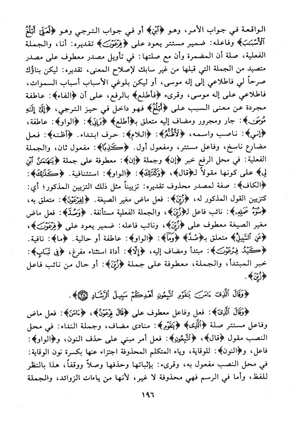الواقعة في جواب الأمر، وهو {ابْنِ} أو في جواب الترجي وهو {لَعَلِّي أَبْلُغُ الْأَسْبَابَ} وفاعله: ضمير مستتر يعود على {فِرْعَوْنُ} تقديره: أنا، والجملة الفعلية، صلة أن المضمرة وأن مع صلتها: في تأويل مصدر معطوف على مصدر متصيد من الجملة التي قبلها من غير سابك لإصلاح المعنى، تقديره: ليكن بناؤُك صرحًا لي فاطلاعي إلى إله موسى، أو ليكن بلوغي الأسباب أسباب السموات، فاطلاعي على إله موسى، وقرىء {فأطلع} بالرفع، على أن {الفاء}: عاطفة مجردة عن معنى السبب على {أَبْلُغُ} فهو داخل في حيز الترجي، {إِلَى إِلَهِ مُوسَى}: جار ومجرور ومضاف إليه متعلق بـ {أطلع} {وَإِنِّي}: {الواو}: عاطفة، {إني}: ناصب واسمه، {لَأَظُنُّهُ}: {اللام}: حرف ابتداء. {أظنه}: فعل مضارع ناسخ، وفاعل مستتر، ومفعول أول. {كَاذِبًا}: مفعول ثان، والجملة الفعلية: في محل الرفع خبر {إن} وجملة {إن}: معطوفة على جملة {يَا هَامَانُ ابْنِ لِي} على كونها مقولًا لـ {قال}، {وَكَذَلِكَ}: {الواو}: استئنافية. {كَذَلِكَ}: {الكاف}: صفة لمصدر محذوف تقديره: تزيينًا مثل ذلك التزيين المذكور؛ أي: كتزيين القول المذكور له، {زُيِّنَ}: فعل ماض مغير الصيغة. {لِفِرْعَوْنَ}: متعلق به، {سُوءُ عَمَلِهِ}: نائب فاعل لـ {زُيِّنَ}، والجملة الفعلية مستأنفة. {وَصُدَّ}: فعل ماض مغير الصيغة معطوف على {زُيِّنَ}، ونائب فاعله: ضمير يعود على {فِرْعَوْنَ}، {عَنِ السَّبِيلِ} متعلق بـ {صُدَّ} {وَمَا}: {الواو}: عاطفة أو حالية. {ما}: نافية. {كَيْدُ فِرْعَوْنَ}: مبتدأ ومضاف إليه، {إِلَّا}: أداة استثناء مفرغ، {في تَبَابٍ}: خبر المبتدأ، والجملة، معطوفة على جملة {زُيِّنَ}: أو حال من نائب فاعل {زُيِّنَ}.