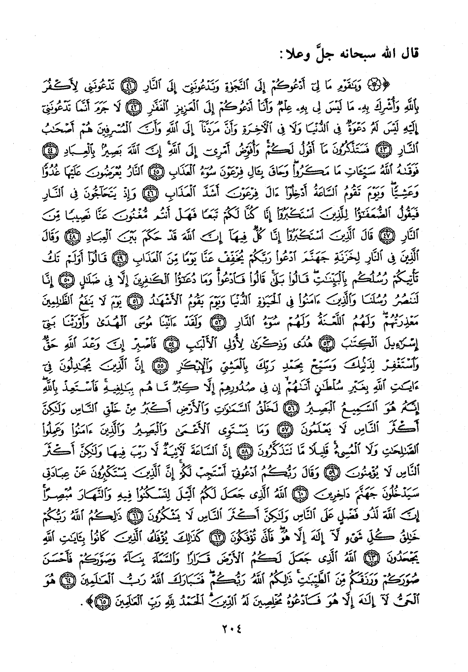 {وَيَا قَوْمِ مَا لِي أَدْعُوكُمْ إِلَى النَّجَاةِ وَتَدْعُونَنِي إِلَى النَّارِ (41) تَدْعُونَنِي لِأَكْفُرَ بِاللهِ وَأُشْرِكَ بِهِ مَا لَيْسَ لِي بِهِ عِلْمٌ وَأَنَا أَدْعُوكُمْ إِلَى الْعَزِيزِ الْغَفَّارِ (42) لَا جَرَمَ أَنَّمَا تَدْعُونَنِي إِلَيْهِ لَيْسَ لَهُ دَعْوَةٌ في الدُّنْيَا وَلَا في الْآخِرَةِ وَأَنَّ مَرَدَّنَا إِلَى اللهِ وَأَنَّ الْمُسْرِفِينَ هُمْ أَصْحَابُ النَّارِ (43) فَسَتَذْكُرُونَ مَا أَقُولُ لَكُمْ وَأُفَوِّضُ أَمْرِي إِلَى اللهِ إِنَّ اللهَ بَصِيرٌ بِالْعِبَادِ (44) فَوَقَاهُ الله سَيِّئَاتِ مَا مَكَرُوا وَحَاقَ بِآلِ فِرْعَوْنَ سُوءُ الْعَذَابِ (45) النَّارُ يُعْرَضُونَ عَلَيْهَا غُدُوًّا وَعَشِيًّا وَيَوْمَ تَقُومُ السَّاعَةُ أَدْخِلُوا آلَ فِرْعَوْنَ أَشَدَّ الْعَذَابِ (46) وَإِذْ يَتَحَاجُّونَ في النَّارِ فَيَقُولُ الضُّعَفَاءُ لِلَّذِينَ اسْتَكْبَرُوا إِنَّا كُنَّا لَكُمْ تَبَعًا فَهَلْ أَنْتُمْ مُغْنُونَ عَنَّا نَصِيبًا مِنَ النَّارِ (47) قَالَ الَّذِينَ اسْتَكْبَرُوا إِنَّا كُلٌّ فِيهَا إِنَّ اللهَ قَدْ حَكَمَ بَيْنَ الْعِبَادِ (48) وَقَالَ الَّذِينَ في النَّارِ لِخَزَنَةِ جَهَنَّمَ ادْعُوا رَبَّكُمْ يُخَفِّفْ عَنَّا يَوْمًا مِنَ الْعَذَابِ (49) قَالُوا أَوَلَمْ تَكُ تَأْتِيكُمْ رُسُلُكُمْ بِالْبَيِّنَاتِ قَالُوا بَلَى قَالُوا فَادْعُوا وَمَا دُعَاءُ الْكَافِرِينَ إِلَّا في ضَلَالٍ (50) إِنَّا لَنَنْصُرُ رُسُلَنَا وَالَّذِينَ آمَنُوا في الْحَيَاةِ الدُّنْيَا وَيَوْمَ يَقُومُ الْأَشْهَادُ (51) يَوْمَ لَا يَنْفَعُ الظَّالِمِينَ مَعْذِرَتُهُمْ وَلَهُمُ اللَّعْنَةُ وَلَهُمْ سُوءُ الدَّارِ (52) وَلَقَدْ آتَيْنَا مُوسَى الْهُدَى وَأَوْرَثْنَا بَنِي إِسْرَائِيلَ الْكِتَابَ (53) هُدًى وَذِكْرَى لِأُولِي الْأَلْبَابِ (54) فَاصْبِرْ إِنَّ وَعْدَ اللهِ حَقٌّ وَاسْتَغْفِرْ لِذَنْبِكَ وَسَبِّحْ بِحَمْدِ رَبِّكَ بِالْعَشِيِّ وَالْإِبْكَارِ (55) إِنَّ الَّذِينَ يُجَادِلُونَ في آيَاتِ اللهِ بِغَيْرِ سُلْطَانٍ أَتَاهُمْ إِنْ في صُدُورِهِمْ إِلَّا كِبْرٌ مَا هُمْ بِبَالِغِيهِ فَاسْتَعِذْ بِاللهِ إِنَّهُ هُوَ السَّمِيعُ الْبَصِيرُ (56) لَخَلْقُ السَّمَاوَاتِ وَالْأَرْضِ أَكْبَرُ مِنْ خَلْقِ النَّاسِ وَلَكِنَّ أَكْثَرَ النَّاسِ لَا يَعْلَمُونَ (57) وَمَا يَسْتَوِي الْأَعْمَى وَالْبَصِيرُ وَالَّذِينَ آمَنُوا وَعَمِلُوا الصَّالِحَاتِ وَلَا الْمُسِيءُ قَلِيلًا مَا تَتَذَكَّرُونَ (58) إِنَّ السَّاعَةَ لَآتِيَةٌ لَا رَيْبَ فِيهَا وَلَكِنَّ أَكْثَرَ النَّاسِ لَا يُؤْمِنُونَ (59) وَقَالَ رَبُّكُمُ ادْعُونِي أَسْتَجِبْ لَكُمْ إِنَّ الَّذِينَ يَسْتَكْبِرُونَ عَنْ عِبَادَتِي سَيَدْخُلُونَ جَهَنَّمَ دَاخِرِينَ (60) الله الَّذِي جَعَلَ لَكُمُ اللَّيْلَ لِتَسْكُنُوا فِيهِ وَالنَّهَارَ مُبْصِرًا إِنَّ اللهَ لَذُو فَضْلٍ عَلَى النَّاسِ وَلَكِنَّ أَكْثَرَ النَّاسِ لَا يَشْكُرُونَ (61) ذَلِكُمُ الله رَبُّكُمْ خَالِقُ كُلِّ شَيْءٍ لَا إِلَهَ إِلَّا هُوَ فَأَنَّى تُؤْفَكُونَ (62) كَذَلِكَ يُؤْفَكُ الَّذِينَ كَانُوا بِآيَاتِ اللهِ يَجْحَدُونَ (63) الله الَّذِي جَعَلَ لَكُمُ الْأَرْضَ قَرَارًا وَالسَّمَاءَ بِنَاءً وَصَوَّرَكُمْ فَأَحْسَنَ صُوَرَكُمْ وَرَزَقَكُمْ مِنَ الطَّيِّبَاتِ ذَلِكُمُ الله رَبُّكُمْ فَتَبَارَكَ الله رَبُّ الْعَالَمِينَ (64) هُوَ الْحَيُّ لَا إِلَهَ إِلَّا هُوَ فَادْعُوهُ مُخْلِصِينَ لَهُ الدِّينَ الْحَمْدُ لِلَّهِ رَبِّ الْعَالَمِينَ (65)}.