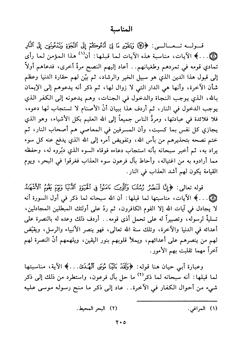 قوله تعالى: {إِنَّا لَنَنْصُرُ رُسُلَنَا وَالَّذِينَ آمَنُوا في الْحَيَاةِ الدُّنْيَا وَيَوْمَ يَقُومُ الْأَشْهَادُ (51) ...} الآيات، مناسبتها لما قبلها: أن الله سبحانه لما ذكر في أول السورة أنه لا يجادل في آيات الله إلا القوم الكافرون، ثم ردّ على أولىك المبطلين المجادلين، تسليةً لرسوله، وتصبيرًا له على تحمل أذى قومه .. أردف ذلك وعده له بالنصرة على أعدائه في الدنيا والآخرة، وتلك سنة الله تعالى، فهو ينصر الأنبياء والرسل، ويقيّض لهم من ينصرهم على أعدائهم، ويملأ قلوبهم بنور اليقين، ويلهمهم أنّ النصرة لهم آخرًا مهما تقلبت بهم الأمور.