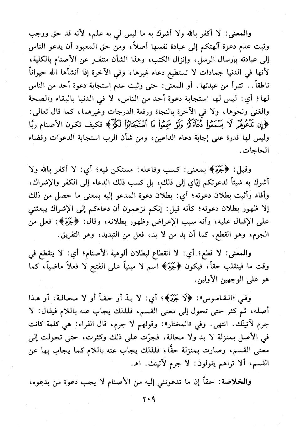 والمعنى: لا أكفر بالله ولا أشرك به ما ليس لي به علم, لأنه قد حق ووجب وثبت عدم دعوة آلهتكم إلى عبادة نفسها أصلًا، ومن حق المعبود أن يدعو الناس إلى عبادته بإرسال الرسل، وإنزال الكتب، وهذا الشأن منتفٍ عن الأصنام بالكلية، لأنها في الدنيا جمادات لا تستطيع دعاء غيرها، وفي الآخرة إذا أنشأها الله حيوانًا ناطقًا .. تتبرأ من عبدتها. أو المعنى: حتى وثبت عدم استجابة دعوة أحد من الناس لها؛ أي: ليس لها استجابة دعوة أحد من الناس، لا في الدنيا بالبقاء والصحة والغنى ونحوها, ولا في الآخرة بالنجاة ورفعة الدرجات وغيرهما، كما قال تعالى: {إِنْ تَدْعُوهُمْ لَا يَسْمَعُوا دُعَاءَكُمْ وَلَوْ سَمِعُوا مَا اسْتَجَابُوا لَكُمْ} فكيف تكون الأصنام ربًّا وليس لها قدرة على إجابة دعاء الداعين، ومن شأن الرب استجابة الدعوات وقضاء الحاجات.