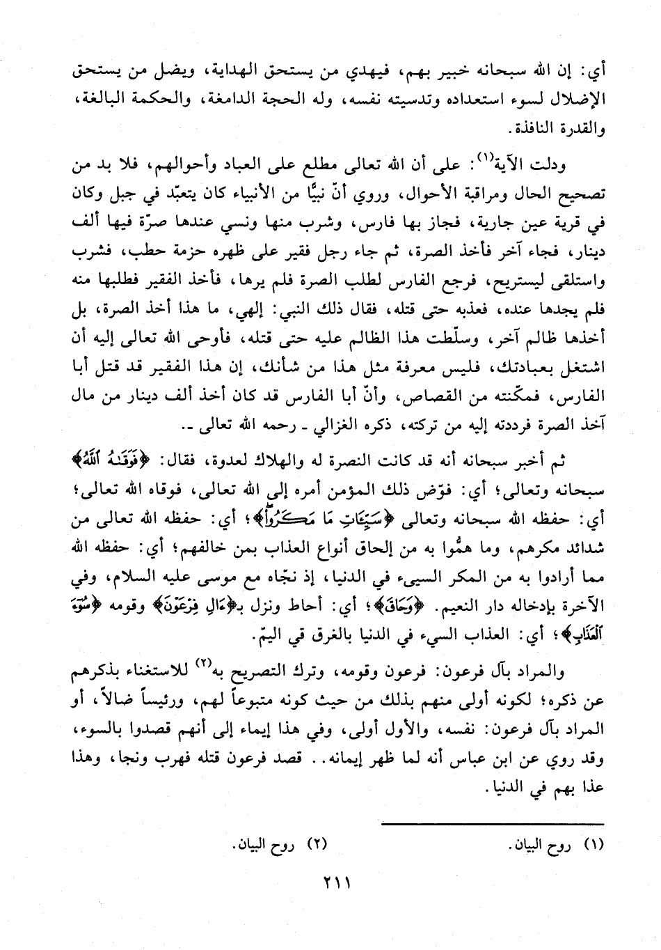 ودلت الآية (¬1): على أن الله تعالى مطلع على العباد وأحوالهم، فلا بد من تصحيح الحال ومراقبة الأحوال، وروي أنّ نبيًّا من الأنبياء كان يتعبّد في جبل وكان في قرية عين جارية، فجاز بها فارس، وشرب منها ونسي عندها صرّة فيها ألف دينار، فجاء آخر فأخذ الصرة، ثم جاء رجل فقير على ظهره حزمة حطب، فشرب واستلقى ليستريح، فرجع الفارس لطلب الصرة فلم يرها، فأخذ الفقير فطلبها منه فلم يجدها عنده، فعذبه حتى قتله، فقال ذلك النبي: إلهي، ما هذا أخذ الصرة، بل أخذها ظالم آخر، وسلّطت هذا الظالم عليه حتى قتله، فأوحى الله تعالى إليه أن اشتغل بعبادتك، فليس معرفة مثل هذا من شأنك، إن هذا الفقير قد قتل أبا الفارس، فمكّنته من القصاص، وأنّ أبا الفارس قد كان أخذ ألف دينار من مال آخذ الصرة فرددته إليه من تركته، ذكره الغزالي - رحمه الله تعالى -.