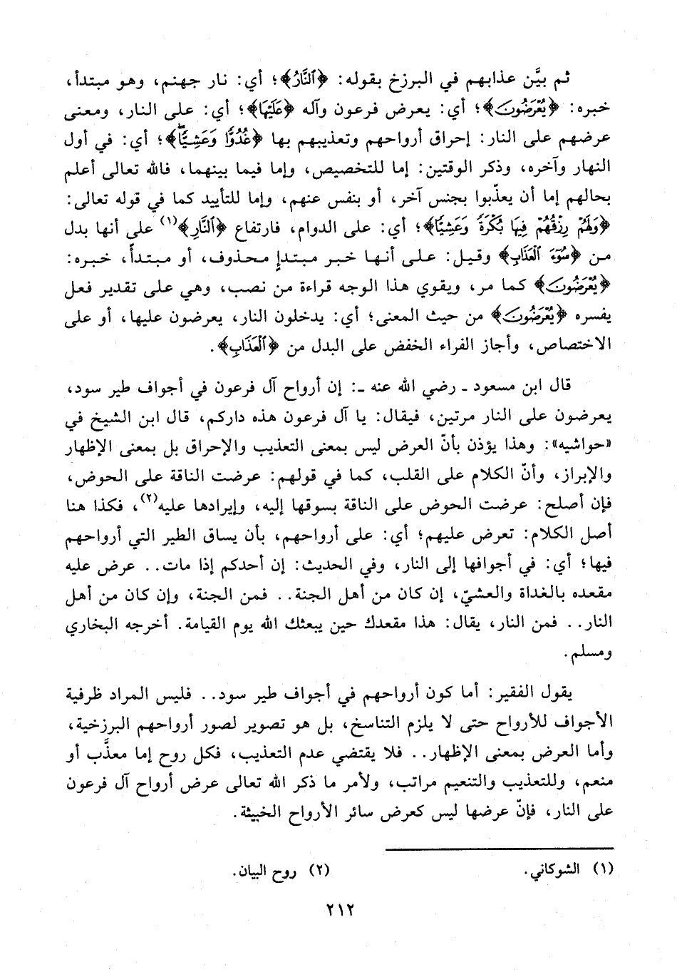 يقول الفقير: أما كون أرواحهم في أجواف طير سود .. فليس المراد ظرفية الأجواف للأرواح حتى لا يلزم التناسخ، بل هو تصوير لصور أرواحهم البرزخية، وأما العرض بمعنى الإظهار .. فلا يقتضي عدم التعذيب، فكل روح إما معذَّب أو منعم، وللتعذيب والتنعيم مراتب، ولأمر ما ذكر الله تعالى عرض أرواح آل فرعون على النار، فإنّ عرضها ليس كعرض سائر الأرواح الخبيثة.