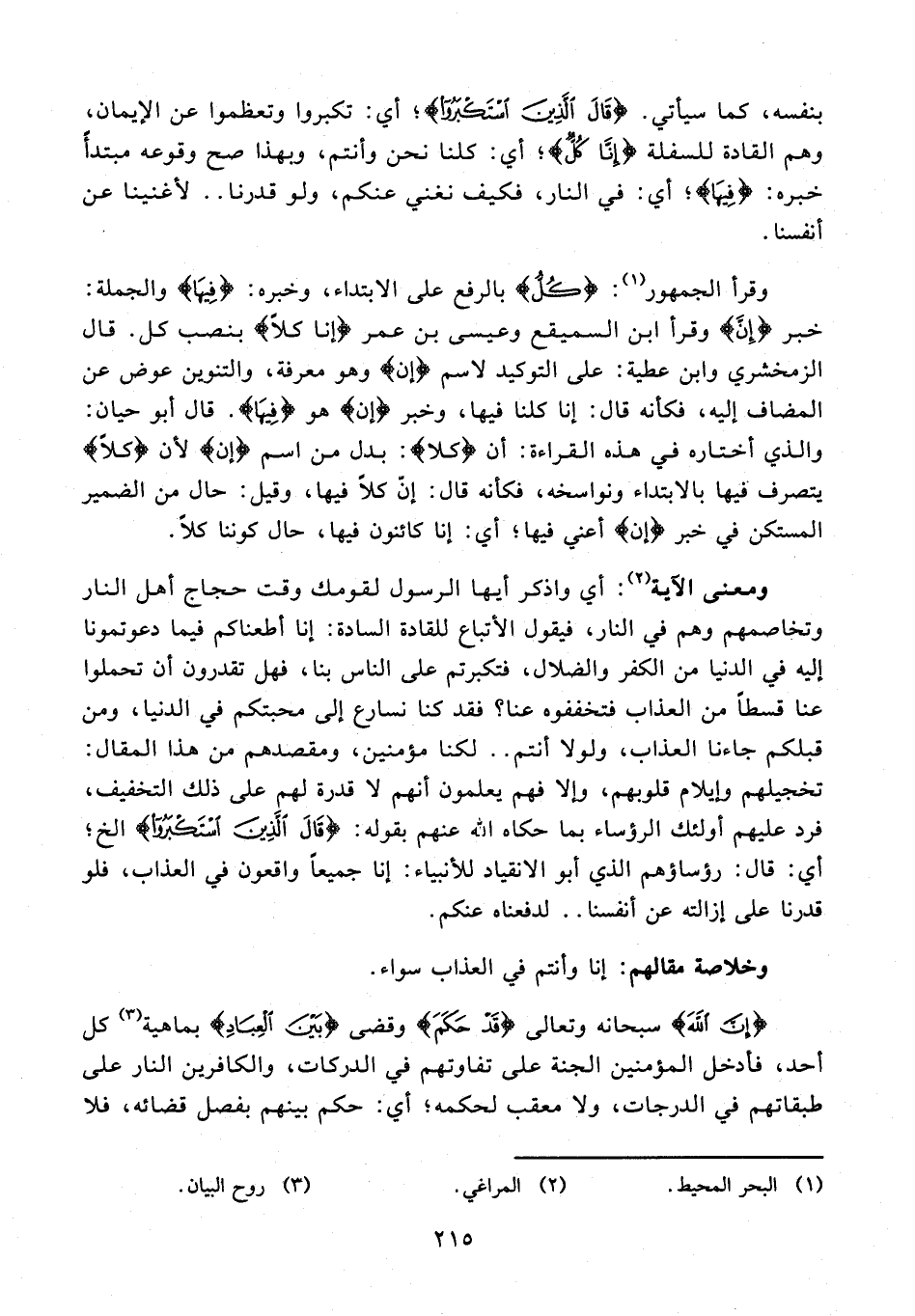 48 - {قَالَ الَّذِينَ اسْتَكْبَرُوا}؛ أي: تكبروا وتعظموا عن الإيمان, وهم القادة للسفلة {إِنَّا كُلٌّ}؛ أي: كلنا نحن وأنتم، وبهذا صح وقوعه مبتدأَ خبره: {فِيهَا}؛ أي: في النار، فكيف نغني عنكم، ولو قدرنا .. لأغنينا عن أنفسنا.