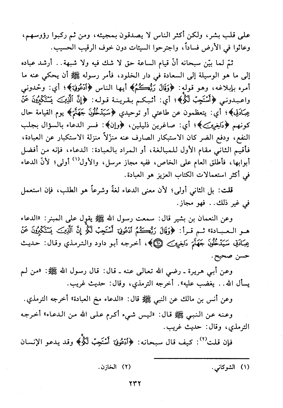 وعن النعمان بن بشير قال: سمعت رسول الله - صلى الله عليه وسلم - يقول على المنبر: "الدعاء هو العبادة" ثم قرأ: {وَقَالَ رَبُّكُمُ ادْعُونِي أَسْتَجِبْ لَكُمْ إِنَّ الَّذِينَ يَسْتَكْبِرُونَ عَنْ عِبَادَتِي سَيَدْخُلُونَ جَهَنَّمَ دَاخِرِينَ (60)}، أخرجه أبو داود والترمذي وقال: حديث حسن صحيح.