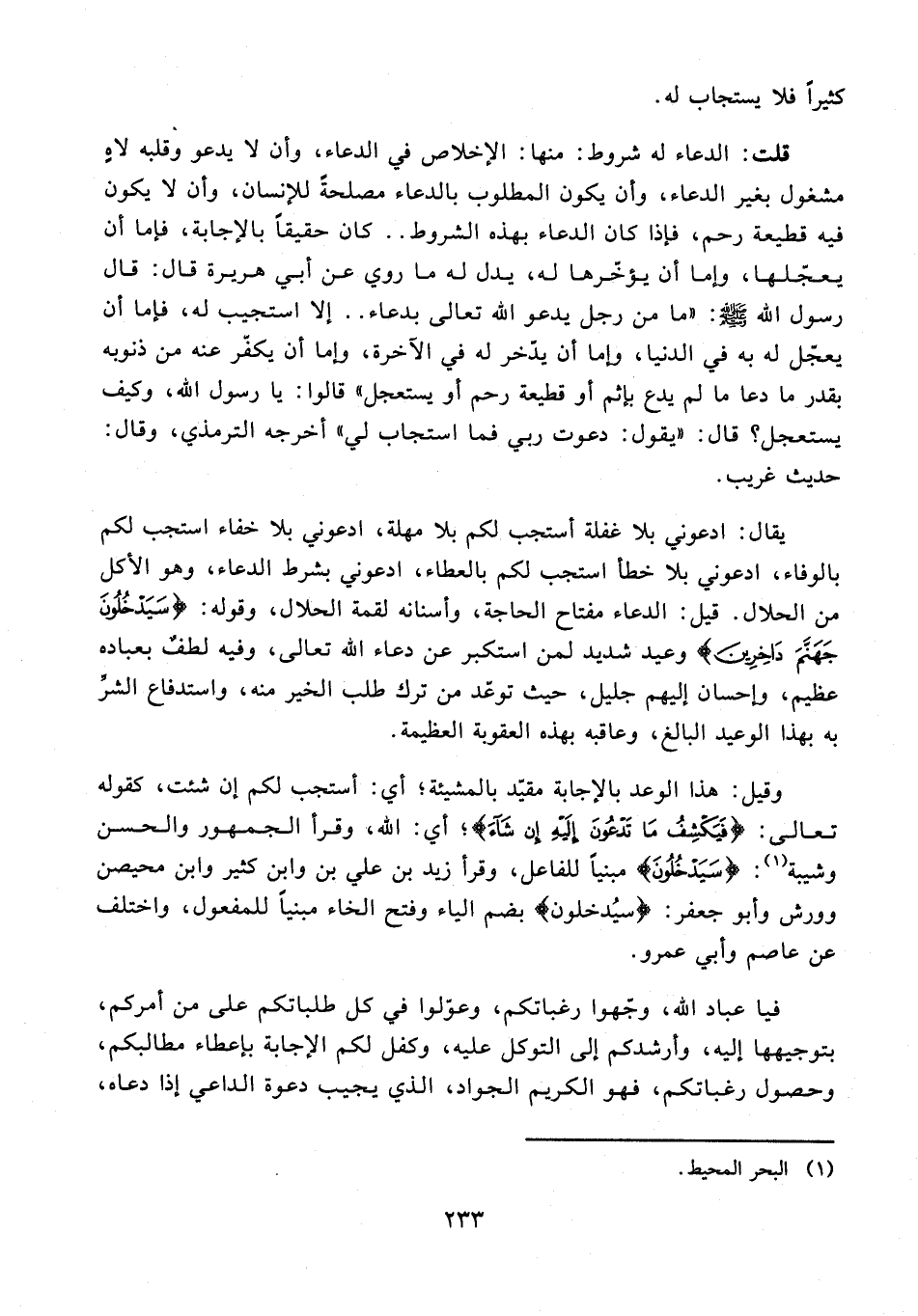 قلت: الدعاء له شروط: منها: الإخلاص في الدعاء، وأن لا يدعو وقلبه لاهٍ مشغول بغير الدعاء، وأن يكون المطلوب بالدعاء مصلحةً للإنسان، وأن لا يكون فيه قطيعة رحم، فإذا كان الدعاء بهذه الشروط .. كان حقيقًا بالإجابة، فإما أن يعجّلها، وإما أن يؤخّرها له، يدل له ما روي عن أبي هريرة قال: قال رسول الله - صلى الله عليه وسلم -: "ما من رجل يدعو الله تعالى بدعاء .. إلا استجيب له، فإما أن يعجّل له به في الدنيا، وإما أن يدّخر له في الآخرة، وإما أن يكفّر عنه من ذنوبه بقدر ما دعا ما لم يدع بإثم أو قطيعة رحم أو يستعجل" قالوا: يا رسول الله، وكيف يستعجل؟ قال: "يقول: دعوت ربي فما استجاب لي" أخرجه الترمذي، وقال: حديث غريب.