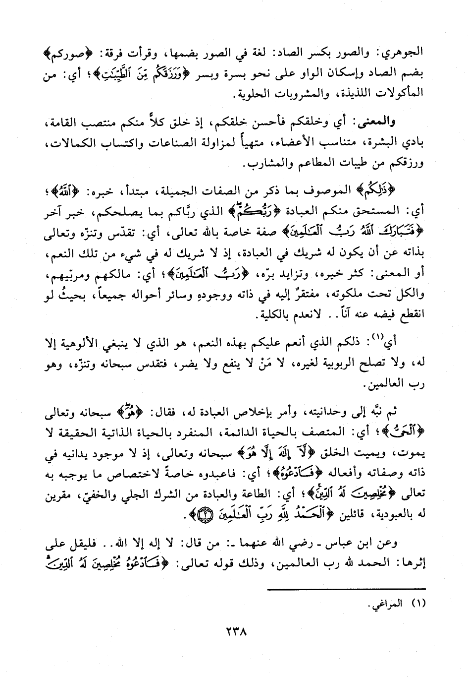 وعن ابن عباس - رضي الله عنهما -: من قال: لا إله إلا الله .. فليقل على إثرها: الحمد لله رب العالمين، وذلك قوله تعالى: {فَادْعُوهُ مُخْلِصِينَ لَهُ الدِّينَ