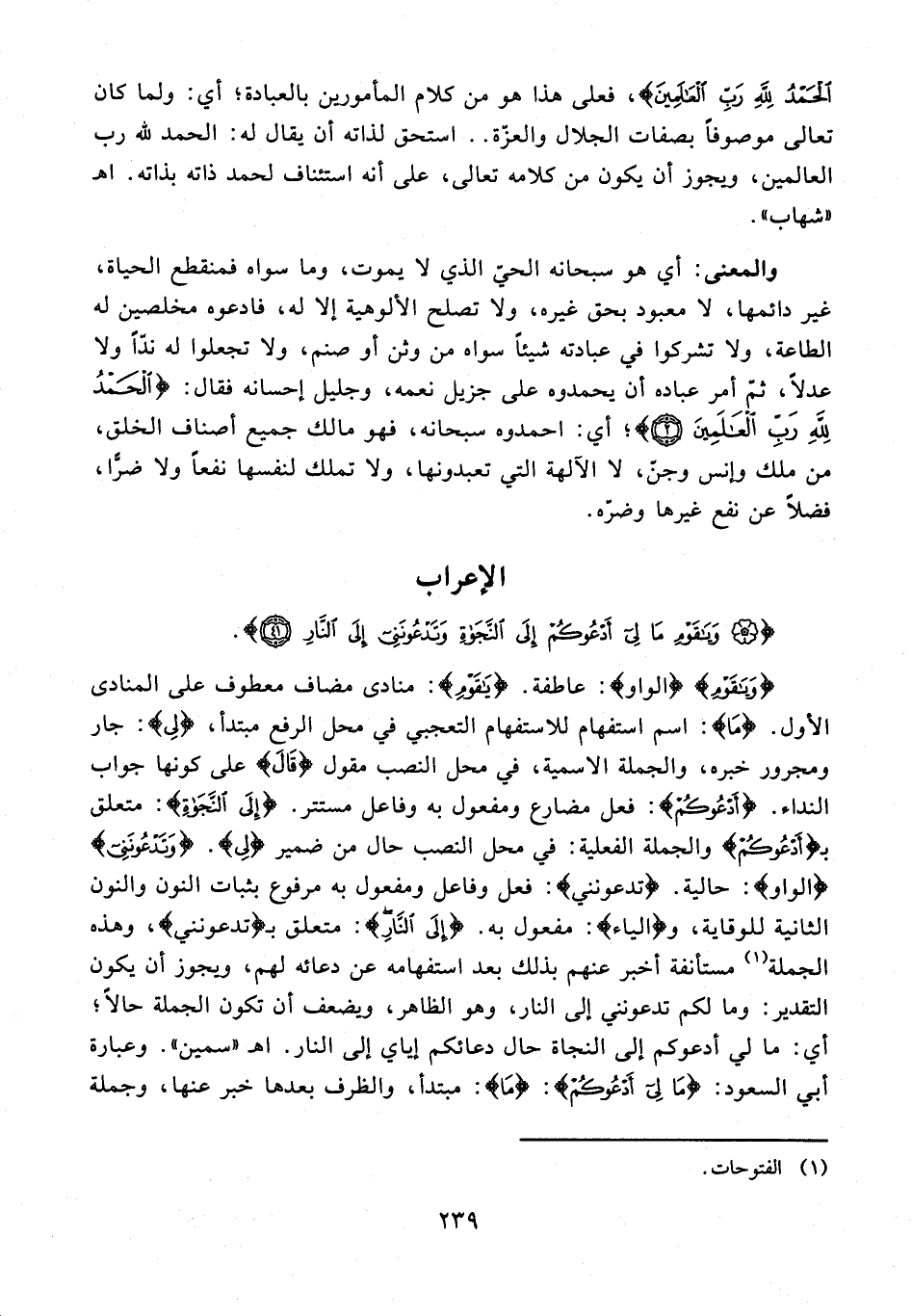 {وَيَا قَوْمِ} {الواو}: عاطفة. {يَا قَوْمِ}: منادى مضاف معطوف على المنادى الأول. {مَا}: اسم استفهام للاستفهام التعجبي في محل الرفع مبتدأ، {لِي}: جار ومجرور خبره، والجملة الاسمية، في محل النصب مقول {قَالَ} على كونها جواب النداء. {أَدْعُوكُمْ}: فعل مضارع ومفعول به وفاعل مستتر. {إِلَى النَّجَاةِ}: متعلق بـ {أَدْعُوكُمْ} والجملة الفعلية: في محل النصب حال من ضمير {لِي}. {وَتَدْعُونَنِي} {الواو}: حالية. {تدعونني}: فعل وفاعل ومفعول به مرفوع بثبات النون والنون الثانية للوقاية، و {الياء}: مفعول به. {إِلَى النَّارِ}: متعلق بـ {تدعونني}، وهذه الجملة (¬1) مستأنفة أخبر عنهم بذلك بعد استفهامه عن دعائه لهم، ويجوز أن يكون التقدير: وما لكم تدعونني إلى النار، وهو الظاهر، ويضعف أن تكون الجملة حالًا؛ أي: ما لي أدعوكم إلى النجاة حال دعائكم إياي إلى النار. اهـ "سمين". وعبارة أبي السعود: {مَا لِي أَدْعُوكُمْ}: {مَا}: مبتدأ، والظرف بعدها خبر عنها، وجملة