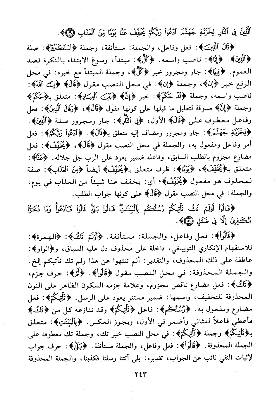 {قَالَ الَّذِينَ}: فعل وفاعل، والجملة: مستأنفة، وجملة {اسْتَكْبَرُوا}: صلة {الَّذِينَ}. {إِنَّا}: ناصب واسمه. {كُلٌّ}: مبتدأ، وسوغ الابتداء بالنكرة قصد العموم. {فِيهَا}: جار ومجرور خبر {كُلٌّ}، وجملة المبتدأ مع خبره: في محل الرفع خبر {إن}، وجملة {إن}: في محل النصب مقول {قَالَ} {إِنَّ اللهَ}: ناصب واسمه، وجملة {قَدْ حَكَمَ}: خبر {إِنَّ} {بَيْنَ الْعِبَادِ}: متعلق بـ {حَكَمَ} وجملة {إِنَّ} مسوقة لتعليل ما قبلها على كونها مقول {قَالَ}، {وَقَالَ الَّذِينَ}: فعل وفاعل معطوف على {قَالَ} الأول، {في النَّارِ}: جار ومجرور صلة {الَّذِينَ}. {لِخَزَنَةِ جَهَنَّمَ}: جار ومجرور ومضاف إليه متعلق بـ {قَالَ}. {ادْعُوا رَبَّكُمْ}: فعل أمر وفاعل ومفعول به، والجملة في محل النصب مقول {قَالَ}، {يُخَفِّفْ}: فعل مضارع مجزوم بالطلب السابق، وفاعله ضمير يعود على الرب جل جلاله. {عَنَّا}: متعلق بـ {يُخَفِّفْ}، {يَوْمًا}: ظرف متعلق بـ {يُخَفِّفْ} أيضًا {مِنَ الْعَذَابِ}: صفة لمحذوف هو مفعول {يُخَفِّفْ}؛ أي: يخفف عنا شيئًا من العذاب في يوم، والجملة: في محل النصب مقول {قَالَ} على كونها جواب الطلب.