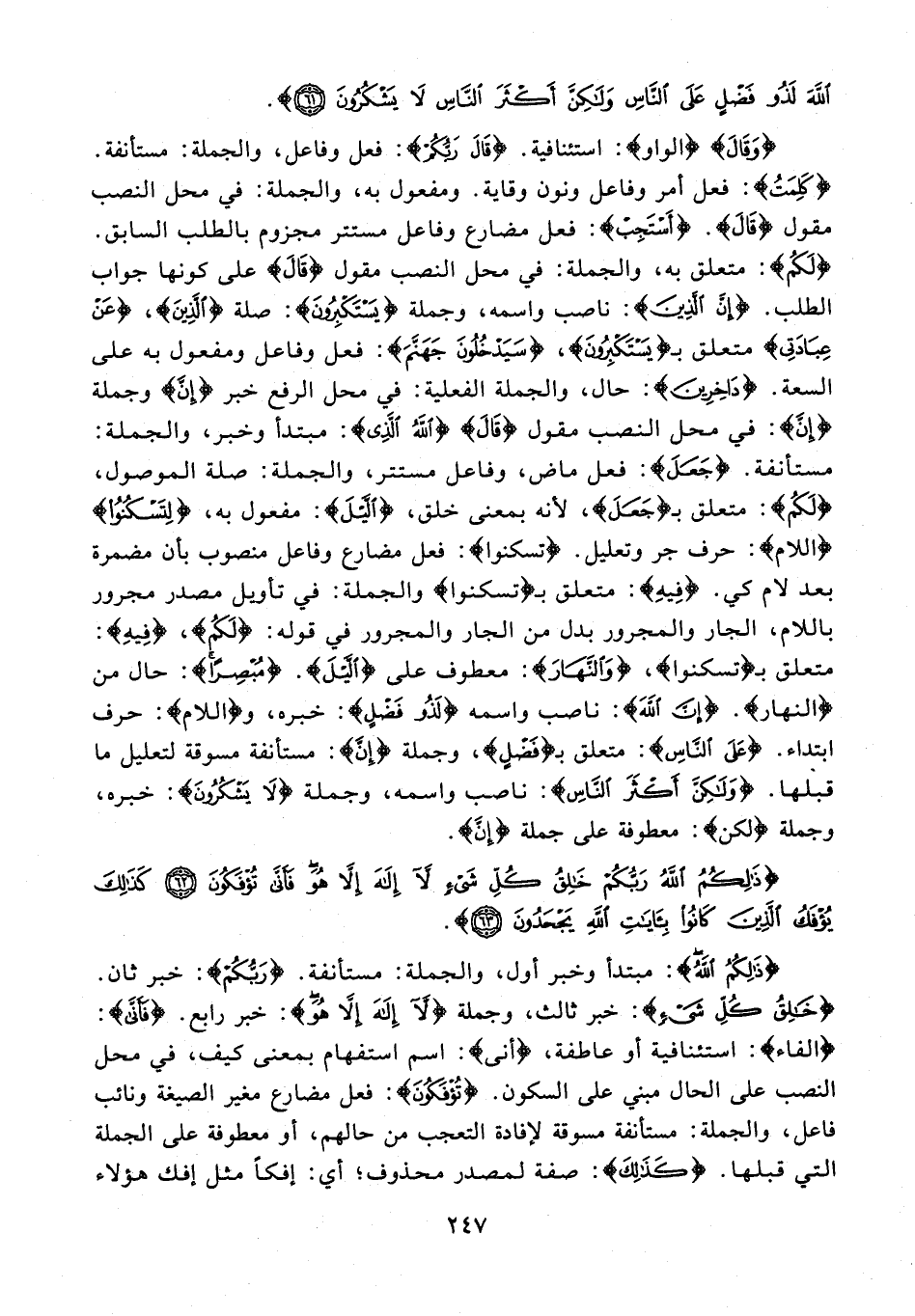 {وَقَالَ} {الواو}: استئنافية. {قَالَ رَبُّكُمُ}: فعل وفاعل، والجملة: مستأنفة. {كَلِمَتُ}: فعل أمر وفاعل ونون وقاية. ومفعول به، والجملة: في محل النصب مقول {قَالَ}. {أَسْتَجِبْ}: فعل مضارع وفاعل مستتر مجزوم بالطلب السابق. {لَكُمْ}: متعلق به، والجملة: في محل النصب مقول {قَالَ} على كونها جواب الطلب. {إِنَّ الَّذِينَ}: ناصب واسمه، وجملة {يَسْتَكْبِرُونَ}: صلة {الَّذِينَ}، {عَنْ عِبَادَتِي} متعلق بـ {يَسْتَكْبِرُونَ}، {سَيَدْخُلُونَ جَهَنَّمَ}: فعل وفاعل ومفعول به على السعة. {دَاخِرِينَ}: حال، والجملة الفعلية: في محل الرفع خبر {إِنَّ} وجملة {إِنَّ}: في محل النصب مقول {قَالَ} {الله الَّذِي}: مبتدأ وخبر، والجملة: مستأنفة. {جَعَلَ}: فعل ماض، وفاعل مستتر، والجملة: صلة الموصول، {لَكُمُ}: متعلق بـ {جَعَلَ}؛ لأنه بمعنى خلق، {اللَّيْلَ}: مفعول به، {لِتَسْكُنُوا} {اللام}: حرف جر وتعليل. {تسكنوا}: فعل مضارع وفاعل منصوب بأن مضمرة بعد لام كي. {فِيهِ}: متعلق بـ {تسكنوا} والجملة: في تأويل مصدر مجرور باللام، الجار والمجرور بدل من الجار والمجرور في قوله: {لَكُمُ}، {فِيهِ}: متعلق بـ {تسكنوا}، {وَالنَّهَارَ}: معطوف على {اللَّيْلَ}. {مُبْصِرًا}: حال من {النهار}. {إِنَّ اللهَ}: ناصب واسمه {لَذُو فَضْلٍ}: خبره، و {اللام}: حرف ابتداء. {عَلَى النَّاسِ}: متعلق بـ {فَضْلٍ}، وجملة {إِنَّ}: مستأنفة مسوقة لتعليل ما قبلها. {وَلَكِنَّ أَكْثَرَ النَّاسِ}: ناصب واسمه، وجملة {لَا يَشْكُرُونَ}: خبره، وجملة {لكن}: معطوفة على جملة {إِنَّ}.