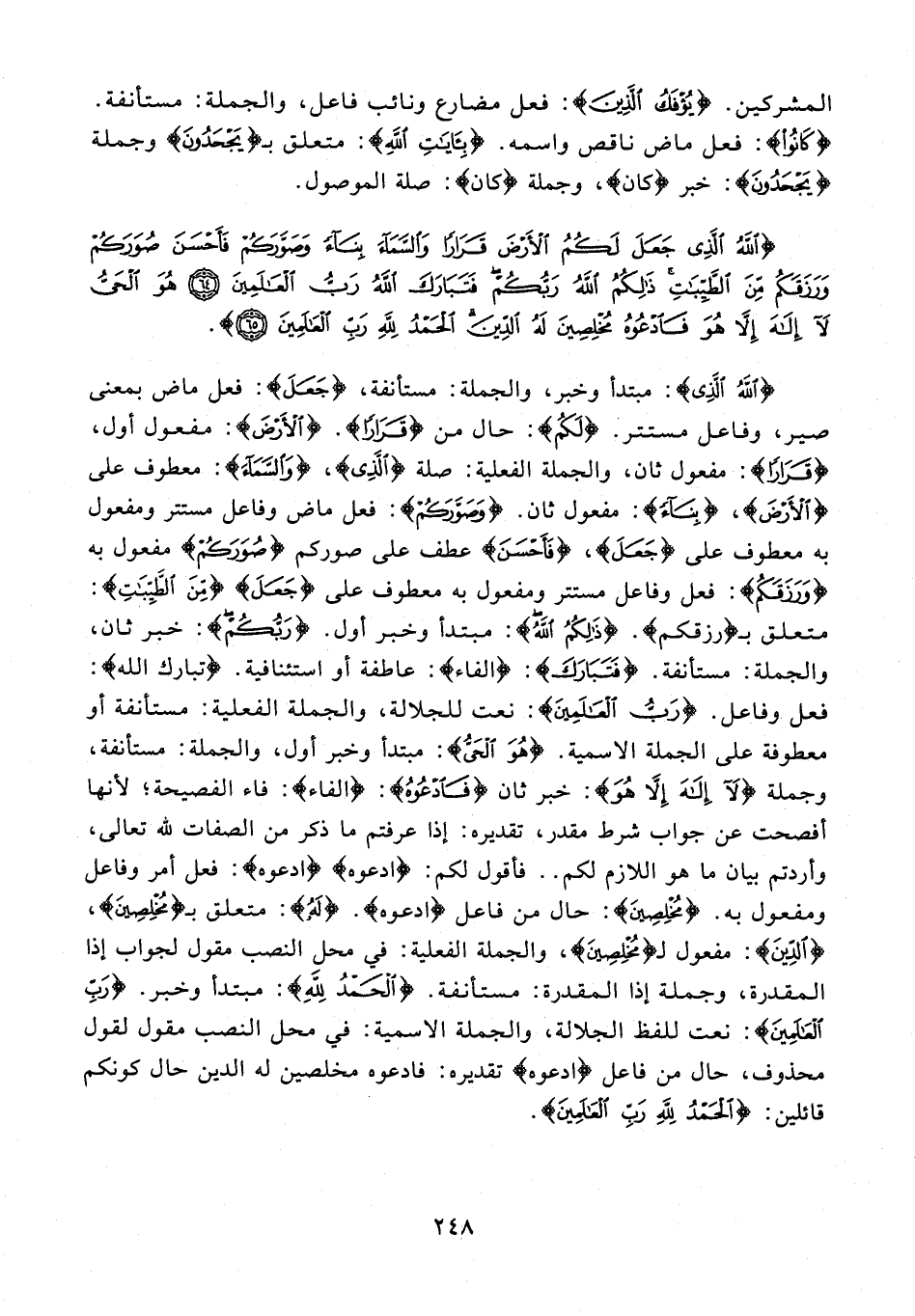 {الله الَّذِي}: مبتدأ وخبر، والجملة: مستأنفة، {جَعَلَ}: فعل ماض بمعنى صير، وفاعل مستتر. {لَكُمُ}: حال من {قَرَارًا}. {الْأَرْضَ}: مفعول أول، {قَرَارًا}: مفعول ثان، والجملة الفعلية: صلة {الَّذِي}، {وَالسَّمَاءَ}: معطوف على {الْأَرْضَ}، {بِنَاءً}: مفعول ثان. {وَصَوَّرَكُمْ}: فعل ماض وفاعل مستتر ومفعول به معطوف على {جَعَلَ}، {فَأَحْسَنَ} عطف على صوركم {صُوَرَكُمْ} مفعول به {وَرَزَقَكُمْ}: فعل وفاعل مستتر ومفعول به معطوف على {جَعَلَ} {مِنَ الطَّيِّبَاتِ}: متعلق بـ {رزقكم}. {ذَلِكُمُ الله}: مبتدأ وخبر أول. {رَبُّكُمْ}: خبر ثان، والجملة: مستأنفة. {فَتَبَارَكَ}: {الفاء}: عاطفة أو استئنافية. {تبارك الله}: فعل وفاعل. {رَبُّ الْعَالَمِينَ}: نعت للجلالة، والجملة الفعلية: مستأنفة أو معطوفة على الجملة الاسمية. {هُوَ الْحَيُّ}: مبتدأ وخبر أول، والجملة: مستأنفة، وجملة {لَا إِلَهَ إِلَّا هُوَ}: خبر ثان {فَادْعُوهُ}: {الفاء}: فاء الفصيحة؛ لأنها أفصحت عن جواب شرط مقدر، تقديره: إذا عرفتم ما ذكر من الصفات لله تعالى، وأردتم بيان ما هو اللازم لكم .. فأقول لكم: {ادعوه} {ادعوه}: فعل أمر وفاعل ومفعول به. {مُخْلِصِينَ}: حال من فاعل {ادعوه}. {لَهُ}: متعلق بـ {مُخْلِصِينَ}، {الدِّينَ}: مفعول لـ {مُخْلِصِينَ}، والجملة الفعلية: في محل النصب مقول لجواب إذا المقدرة، وجملة إذا المقدرة: مستأنفة. {الْحَمْدُ لِلَّهِ}: مبتدأ وخبر. {رَبِّ الْعَالَمِينَ}: نعت للفظ الجلالة، والجملة الاسمية: في محل النصب مقول لقول محذوف، حال من فاعل {ادعوه} تقديره: فادعوه مخلصين له الدين حال كونكم قائلين: {الْحَمْدُ لِلَّهِ رَبِّ الْعَالَمِينَ}.
