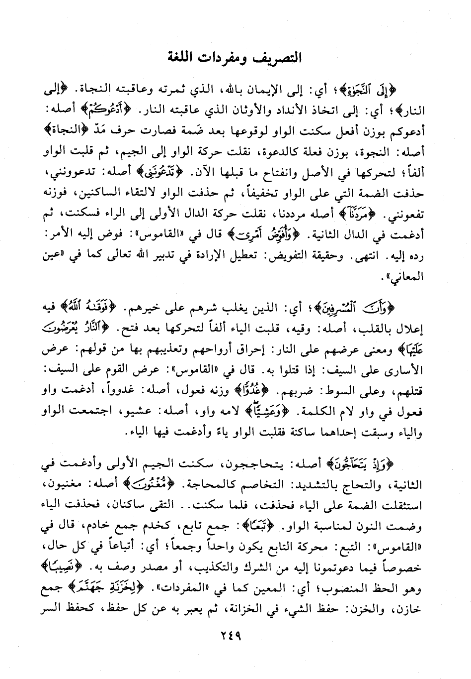{إِلَى النَّجَاةِ}؛ أي: إلى الإيمان بالله، الذي ثمرته وعاقبته النجاة. {إلى النار}؛ أي: إلى اتخاذ الأنداد والأوثان الذي عاقبته النار. {أَدْعُوكُمْ} أصله: أدعوكم بوزن أفعل سكنت الواو لوقوعها بعد ضَمة فصارت حرف مَدّ {النجاة} أصله: النجوة، بوزن فعلة كالدعوة، نقلت حركة الواو إلى الجيم، ثم قلبت الواو ألفًا؛ لتحركها في الأصل وانفتاح ما قبلها الآن. {تَدْعُونَنِي} أصله: تدعوونني، حذفت الضمة التي على الواو تخفيفًا، ثم حذفت الواو لالتقاء الساكنين، فوزنه تفعونني. {مَرَدَّنَا} أصله مرددنا، نقلت حركة الدال الأولى إلى الراء فسكنت، ثم أدغمت في الدال الثانية. {وَأُفَوِّضُ أَمْرِي} قال في "القاموس": فوض إليه الأمر: رده إليه. انتهى. وحقيقة التفويض: تعطيل الإرادة في تدبير الله تعالى كما في "عين المعاني".