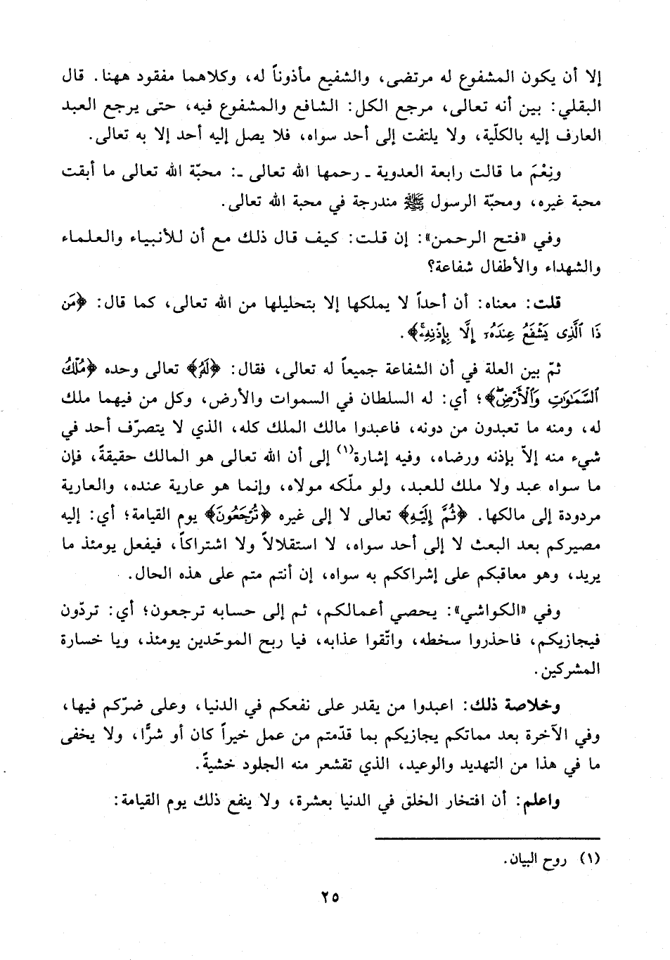 إلا أن يكون المشفوع له مرتضى، والشفيع مأذونًا له، وكلاهما مفقود هاهنا. قال البقلي: بين أنه تعالى، مرجع الكل: الشافع والمشفوع فيه، حتى يرجع العبد العارف إليه بالكلّية، ولا يلتفت إلى أحد سواه، فلا يصل إليه أحد إلا به تعالى.