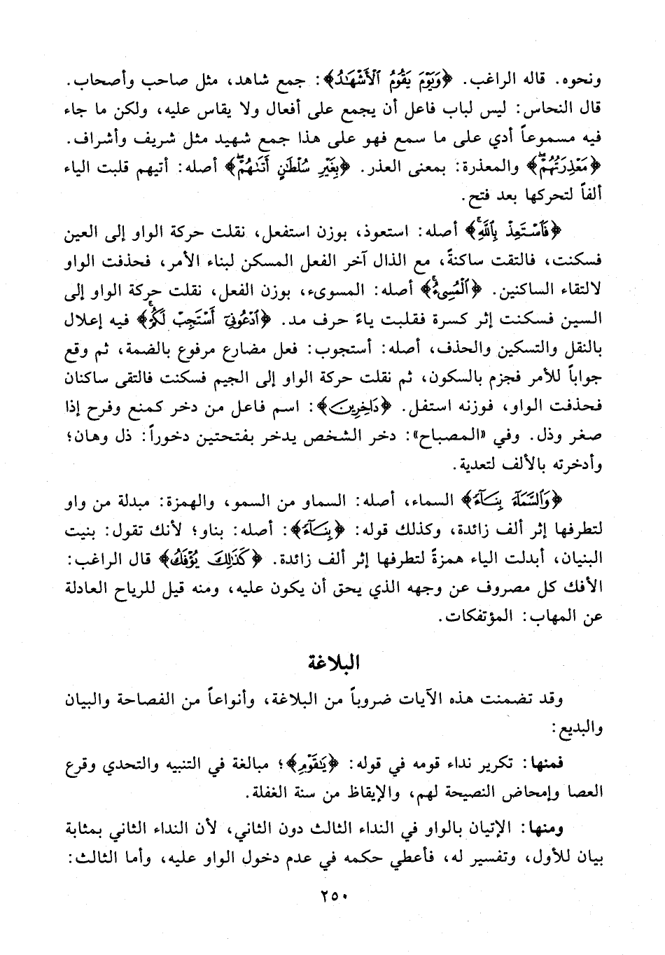 {فَاسْتَعِذْ بِاللهِ} أصله: استعوذ، بوزن استفعل، نقلت حركة الواو إلى العين فسكنت، فالتقت ساكنةً، مع الذال آخر الفعل المسكن لبناء الأمر، فحذفت الواو لالتقاء الساكنين. {الْمُسِيءُ} أصله: المسوىء، بوزن الفعل، نقلت حركة الواو إلى السين فسكنت إثر كسرة فقلبت ياءً حرف مد. {ادْعُونِي أَسْتَجِبْ لَكُمْ} فيه إعلال بالنقل والتسكين والحذف، أصله: أستجوب: فعل مضارع مرفوع بالضمة، ثم وقع جوابًا للأمر فجزم بالسكون، ثم نقلت حركة الواو إلى الجيم فسكنت فالتقى ساكنان فحذفت الواو، فوزنه استفل. {دَاخِرِينَ}: اسم فاعل من دخر كمنع وفرح إذا صغر وذل. وفي "المصباح": دخر الشخص يدخر بفتحتين دخورًا: ذل وهان؛ وأدخرته بالألف لتعدية.