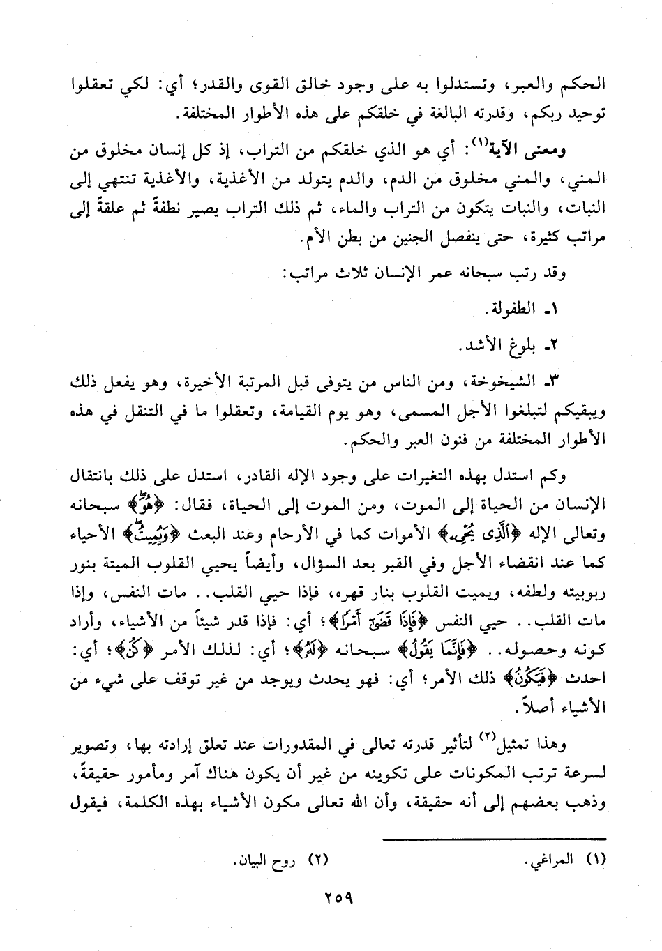3 - الشيخوخة، ومن الناس من يتوفى قبل المرتبة الأخيرة، وهو يفعل ذلك ويبقيكم لتبلغوا الأجل المسمى، وهو يوم القيامة، وتعقلوا ما في التنقل في هذه الأطوار المختلفة من فنون العبر والحكم.