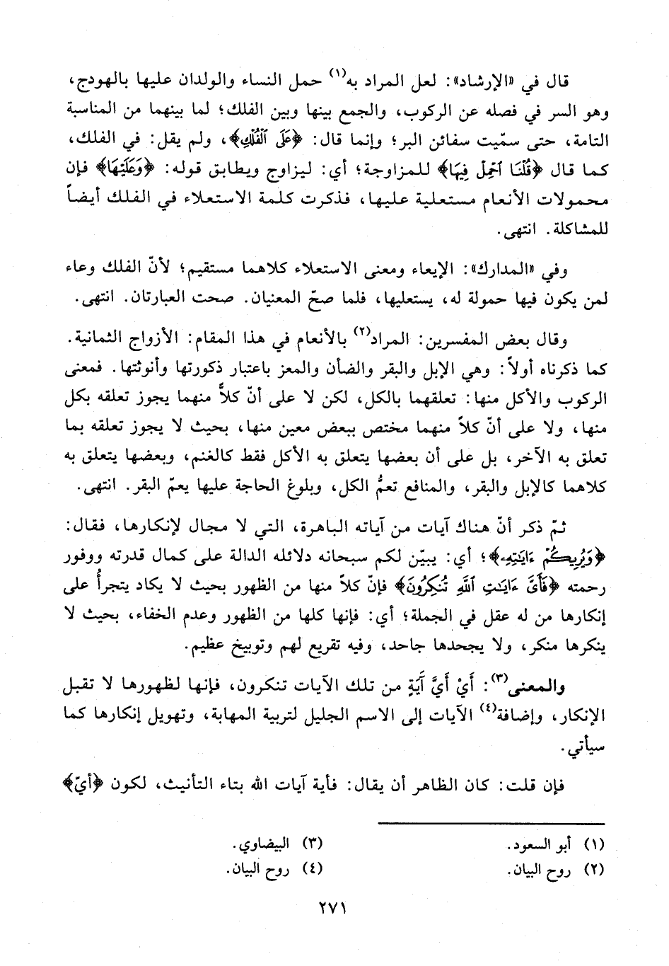 قال في "الإرشاد": لعل المراد به (¬1) حمل النساء والولدان عليها بالهودج، وهو السر في فصله عن الركوب، والجمع بينها وبين الفلك؛ لما بينهما من المناسبة التامة، حتى سمّيت سفائن البر؛ وإنما قال: {وَعَلَى الْفُلْكِ}، ولم يقل: في الفلك، كما قال {قُلْنَا احْمِلْ فِيهَا} للمزاوجة؛ أي: ليزاوج ويطابق قوله: {وَعَلَيْهَا} فإن محمولات الأنعام مستعلية عليها، فذكرت كلمة الاستعلاء في الفلك أيضًا للمشاكلة. انتهى.