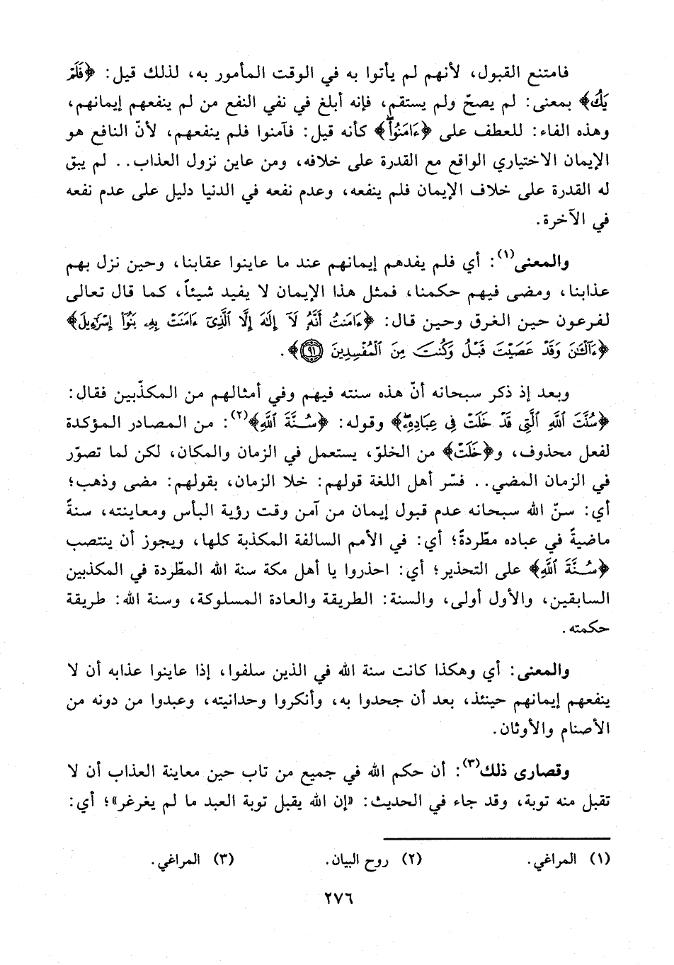 وبعد إذ ذكر سبحانه أنّ هذه سنته فيهم وفي أمثالهم من المكذّبين فقال: {سُنَّتَ اللَّهِ الَّتِي قَدْ خَلَتْ فِي عِبَادِهِ} وقوله: {سُنَّتَ اللَّهِ} (¬2): من المصادر المؤكدة لفعل محذوف، و {خَلَتْ} من الخلوّ، يستعمل في الزمان والمكان، لكن لما تصوّر في الزمان المضي .. فسّر أهل اللغة قولهم: خلا الزمان، بقولهم: مضى وذهب؛ أي: سنّ الله سبحانه عدم قبول إيمان من آمن وقت رؤية البأس ومعاينته، سنةً ماضيةً في عباده مطّردةً؛ أي: في الأمم السالفة المكذبة كلها، ويجوز أن ينتصب {سُنَّتَ اللَّهِ} على التحذير؛ أي: احذروا يا أهل مكة سنة الله المطّردة في المكذبين السابقين، والأول أولى، والسنة: الطريقة والعادة المسلوكة، وسنة الله: طريقة حكمته.