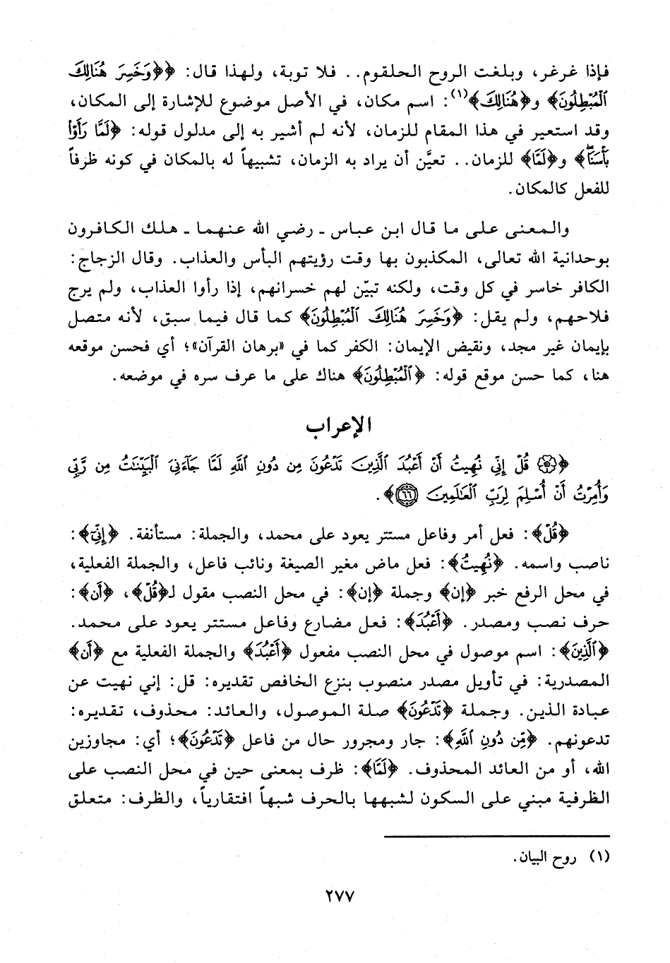 {قُلْ}: فعل أمر وفاعل مستتر يعود على محمد، والجملة: مستأنفة. {إِنِّي}: ناصب واسمه. {نُهِيتُ}: فعل ماض مغير الصيغة ونائب فاعل، والجملة الفعلية، في محل الرفع خبر {إن} وجملة {إن}: في محل النصب مقول لـ {قُل}، {أَن}: حرف نصب ومصدر. {أَعْبُدَ}: فعل مضارع وفاعل مستتر يعود على محمد. {الَّذِينَ}: اسم موصول في محل النصب مفعول {أَعْبُدَ} والجملة الفعلية مع {أَن} المصدرية: في تأويل مصدر منصوب بنزع الخافص تقديره: قل: إني نهيت عن عبادة الذين. وجملة {تَدْعُونَ} صلة الموصول، والعائد: محذوف، تقديره: تدعونهم. {مِنْ دُونِ اللَّهِ}: جار ومجرور حال من فاعل {تَدْعُونَ}؛ أي: مجاوزين الله، أو من العائد المحذوف. {لَمَّا}: ظرف بمعنى حين في محل النصب على الظرفية مبني على السكون لشبهها بالحرف شبهًا افتقاريًا، والظرف: متعلق
