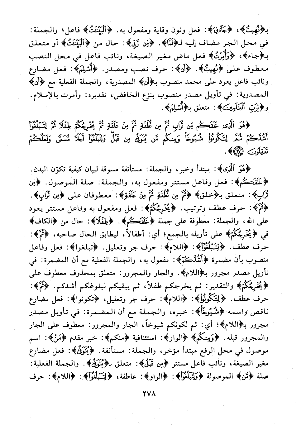 {هُوَ الَّذِي}: مبتدأ وخبر، والجملة: مستأنفة مسوقة لبيان كيفية تكوّن البدن. {خَلَقَكُمْ}: فعل وفاعل مستتر ومفعول به، والجملة: صلة الموصول. {مِنْ تُرَابٍ}: متعلق بـ {خلق} {ثُمَّ مِنْ نُطْفَةٍ ثُمَّ مِنْ عَلَقَةٍ}: معطوفان على {مِنْ تُرَابٍ}. {ثُمَّ}: حرف عطف وترتيب. {يُخْرِجُكُمْ}: فعل ومفعول به وفاعل مستتر يعود على الله، والجملة: معطوفة على جملة {خَلَقَكُمْ} {طِفْلًا}: حال من {الكاف} في {يُخْرِجُكُمْ} على تأويله بالجمع؛ أي: أطفالًا، ليطابق الحال صاحبه، {ثُمَّ}: حرف عطف. {لِتَبْلُغُوا}: {اللام}: حرف جر وتعليل. {تبلغوا}: فعل وفاعل منصوب بأن مضمرة {أَشُدَّكُمْ}: مفعول به، والجملة الفعلية مع أن المضمرة: في تأويل مصدر مجرور بـ {اللام}. والجار والمجرور: متعلق بمحذوف معطوف على {يُخْرِجُكُمْ} والتقدير: ثم يخرجكم طفلًا، ثم يبقيكم لبلوغكم أشدكم. {ثُمَّ}: حرف عطف. {لِتَكُونُوا}: {اللام}: حرف جر وتعليل، {تكونوا}: فعل مضارع ناقص واسمه {شُيُوخًا}: خبره، والجملة مع أن المضمرة: في تأويل مصدر مجرور بـ {اللام}؛ أي: ثم لكونكم شيوخًا، الجار والمجرور: معطوف على الجار والمجرور قبله. {وَمِنْكُمْ} {الواو}: استئنافية {منكم}: خبر مقدم {مَنْ}: اسم موصول في محل الرفع مبتدأ مؤخر، والجملة: مستأنفة. {يُتَوَفَّى}: فعل مضارع مغير الصيغة، ونائب فاعل مستتر {مِنْ قَبْلُ}: متعلق بـ {يُتَوَفَّى}. والجملة الفعلية: صلة {مَّن} الموصولة {وَلِتَبْلُغُوا}: {الواو}: عاطفة، {لِتَبْلُغُوا}: {اللام}: حرف