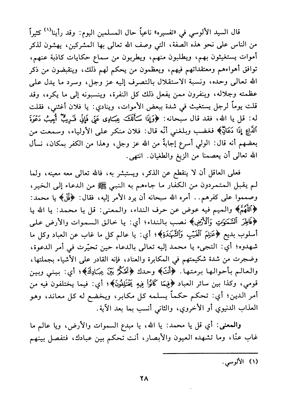 قال السيد الألوسي في "تفسيره" ناعيًا حال المسلمين اليوم: وقد رأينا (¬1) كثيرًا من الناس على نحو هذه الصفة، التي وصف الله تعالى بها المشركين، يهشون لذكر أموات يستغيثون بهم، ويطلبون منهم، ويطربون من سماع حكايات كاذبة عنهم، توافق أهواءهم ومعتقداتم فيهم، ويعظمون من يحكم لهم ذلك، وينقبضون من ذكر الله تعالى وحده، ونسبة الاستقلال بالتصرف إليه عز وجل، وسرد ما يدل على عظمته وجلاله، وينفرون ممن يفعل ذلك كل النفرة، وينسبونه إلى ما يكره، وقد قلت يومًا لرجل يستغيث في شدة ببعض الأموات، وينادي: يا فلان أغثني، فقلت له: قل يا الله، فقد قال سبحانه: {وَإِذَا سَأَلَكَ عِبَادِي عَنِّي فَإِنِّي قَرِيبٌ أُجِيبُ دَعْوَةَ الدَّاعِ إِذَا دَعَانِ} فغضب وبلغني أنّه قال: فلان منكر على الأولياء، وسمعت من بعضهم أنه قال: الولي أسرع إجابة من الله عز وجل، وهذا من الكفر بمكان، نسأل الله تعالى أن يعصمنا من الزيغ والطغيان. انتهى.