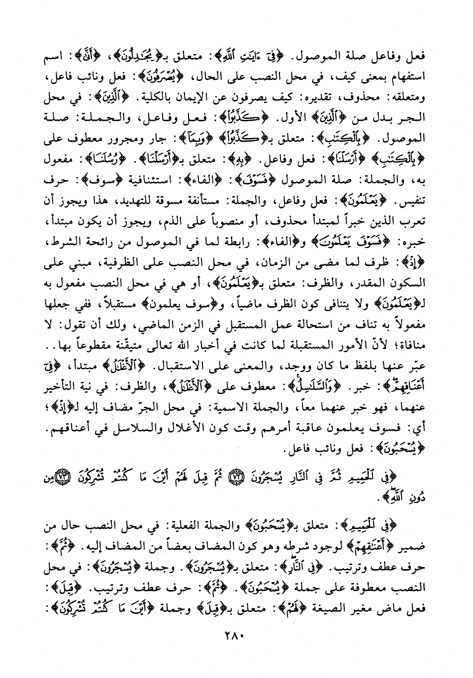 فعل وفاعل صلة الموصول. {فِي آيَاتِ اللَّهِ}: متعلق بـ {يُجَادِلُونَ}، {أَنَّى}: اسم استفهام بمعنى كيف، في محل النصب على الحال، {يُصْرَفُونَ}: فعل ونائب فاعل، ومتعلقه: محذوف، تقديره: كيف يصرفون عن الإيمان بالكلية. {الَّذِينَ}: في محل الجر بدل من {الَّذِينَ} الأول. {كَذَّبُوا}: فعل وفاعل، والجملة: صلة الموصول. {بِالْكِتَابِ}: متعلق بـ {كَذَّبُوا} {وَبِمَا}: جار ومجرور معطوف على {بِالْكِتَابِ} {أَرْسَلْنَا}: فعل وفاعل. {بِهِ}: متعلق بـ {أَرْسَلْنَا}. {رُسُلَنَا}: مفعول به، والجملة: صلة الموصول {فَسَوْفَ}: {الفاء}: استئنافية {سوف}: حرف تنفيس. {يَعْلَمُونَ}: فعل وفاعل، والجملة: مستأنفة مسوقة للتهديد، هذا ويجوز أن تعرب الذين خبرًا لمبتدأ محذوف، أو منصوبًا على الذم، ويجوز أن يكون مبتدأ، خبره: {فَسَوْفَ يَعْلَمُونَ} و {الفاء}: رابطة لما في الموصول من رائحة الشرط، {إِذ}: ظرف لما مضى من الزمان، في محل النصب على الظرفية، مبني على السكون المقدر، والظرت: متعلق بـ {يَعْلَمُونَ}، أو هي في محل النصب مفعول به لـ {يَعْلَمُونَ} ولا يتنافى كون الظرف ماضيًا، و {سوف يعلمون} مستقبلًا، ففي جعلها مفعولًا به تناف من استحالة عمل المستقبل في الزمن الماضي، ولك أن تقول: لا منافاة؛ لأنّ الأمور المستقبلة لما كانت في أخبار الله تعالى متيقّنة مقطوعًا بها .. عبّر عنها بلفظ ما كان ووجد، والمعنى على الاستقبال. {الْأَغْلَالُ} مبتدأ، {فِي أَعْنَاقِهِمْ}: خبر. {وَالسَّلَاسِلُ}: معطوف على {الْأَغْلَالُ}، والظرف: في نية التأخير عنهما، فهو خبر عنهما معًا، والجملة الاسمية: في محل الجرّ مضاف إليه لـ {إِذِ}؛ أي: فسوف يعلمون عاقبة أمرهم وقت كون الأغلال والسلاسل في أعناقهم. {يُسْحَبُونَ}: فعل ونائب فاعل.