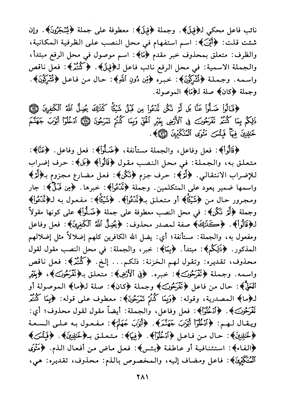 {قَالُوا}: فعل وفاعل، والجملة مستأنفة، {ضَلُّوا}: فعل وفاعل. {عَنَّا}: متعلق به، والجملة: في محل النصب مقول {قَالُوا} {بَل}: حرف إضراب للإضراب الانتقالي. {لَمْ}: حرف جزم {نَكُنْ}: فعل مضارع مجزوم بـ {لَمْ} واسمها ضمير يعود على المتكلمين. وجملة {نَدْعُو}: خبرها. {مِنْ قَبْلُ}: جار ومجرور حال من {شَيْئًا} أو متعلق بـ {نَدْعُو}. {شَيْئًا}: مفعول به لـ {نَدْعُو} وجملة {لَمْ نَكُنْ}: في محل النصب معطوفة على جملة {ضَلُّوا} على كونا مقولًا لـ {قَالُوا}. {كَذَلِكَ} صفة لمصدر محذوف: {يُضِلُّ اللَّهُ الْكَافِرِينَ}: فعل وفاعل ومفعول به، والجملة: مستأنفة؛ أي: يضل الله الكافرين كلهم إضلالًا مثل إضلالهم المذكور. {ذَلِكُمْ}: مبتدأ. {بِمَا}: خبر، والجملة: في محل النصب مقول لقول محذوف، تقديره: وتقول لهم الخزنة: ذلكم ... إلخ. {كُنْتُمْ}: فعل ناقص واسمه. وجملة {تَفْرَحُونَ}: خبره. {فِي الْأَرْضِ}: متعلق بـ {تَفْرَحُونَ}، {بِغَيْرِ الْحَقِّ}: حال من فاعل {تَفْرَحُونَ} وجملة {كان}: صلة لـ {ما} الموصولة أو لـ {ما} المصدرية، وقوله: {وَبِمَا كُنْتُمْ تَمْرَحُونَ}: معطوف على قوله: {بِمَا كُنْتُمْ تَفْرَحُونَ}. {ادْخُلُوا}: فعل وفاعل، والجملة: أيضًا مقول لقول محذوف؛ أي: ويقال لهم: {ادْخُلُوا أَبْوَابَ جَهَنَّمَ}. {أَبْوَابَ جَهَنَّمَ}: مفعول به على السعة {خَالِدِينَ}: حال من فاعل {ادْخُلُوا}. {فِيهَا}: متعلق بـ {خَالِدِينَ}. {فَبِئْسَ} {الفاء}: استئنافية أو عاطفة {بئس}: فعل ماض من أفعال الذم. {مَثْوَى الْمُتَكَبِّرِينَ}: فاعل ومضاف إليه، والمخصوص بالذم: محذوف، تقديره: هي،