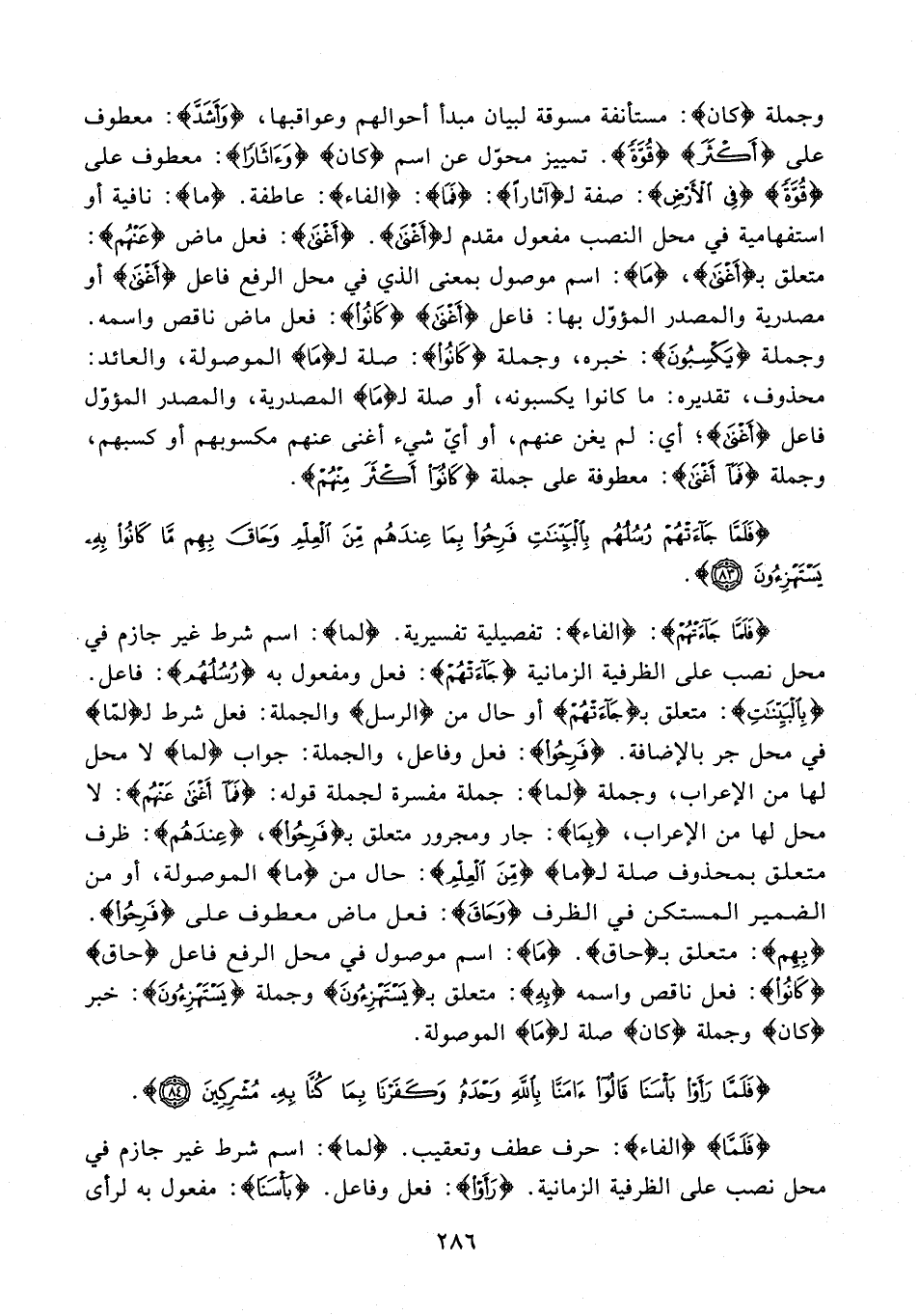 {فَلَمَّا جَاءَتْهُمْ}: {الفاء}: تفصيلية تفسيرية. {لما}: اسم شرط غير جازم في محل نصب على الظرفية الزمانية {جَاءَتْهُمْ}: فعل ومفعول به {رُسُلُهُمْ}: فاعل. {بِالْبَيِّنَاتِ}: متعلق بـ {جَاءَتْهُمْ} أو حال من {الرسل} والجملة: فعل شرط لـ {لمّا} في محل جر بالإضافة. {فَرِحُوا}: فعل وفاعل، والجملة: جواب {لما} لا محل لها من الإعراب، وجملة لما: جملة مفسرة لجملة قوله: {فَمَا أَغْنَى عَنْهُمْ}: لا محل لها من الإعراب، {بِمَا}: جار ومجرور متعلق بـ {فَرِحُوا}، {عِندَهُم}: ظرف متعلق بمحذوف صلة لـ {ما} {مِنَ الْعِلْمِ}: حال من {ما} الموصولة، أو من الضمير المستكن في الظرف {وَحَاقَ}: فعل ماض معطوف على {فَرِحُوا}. {بِهِم}: متعلق بـ {حاق}. {مَا}: اسم موصول في محل الرفع فاعل {حاق} {كَانُوا}: فعل ناقص واسمه {بِهِ}: متعلق بـ {يَسْتَهْزِئُونَ} وجملة {يَسْتَهْزِئُونَ}: خبر {كان} وجملة {كان} صلة لـ {مَا} الموصولة.